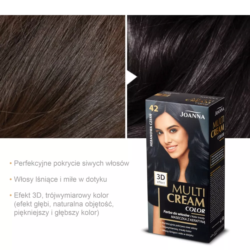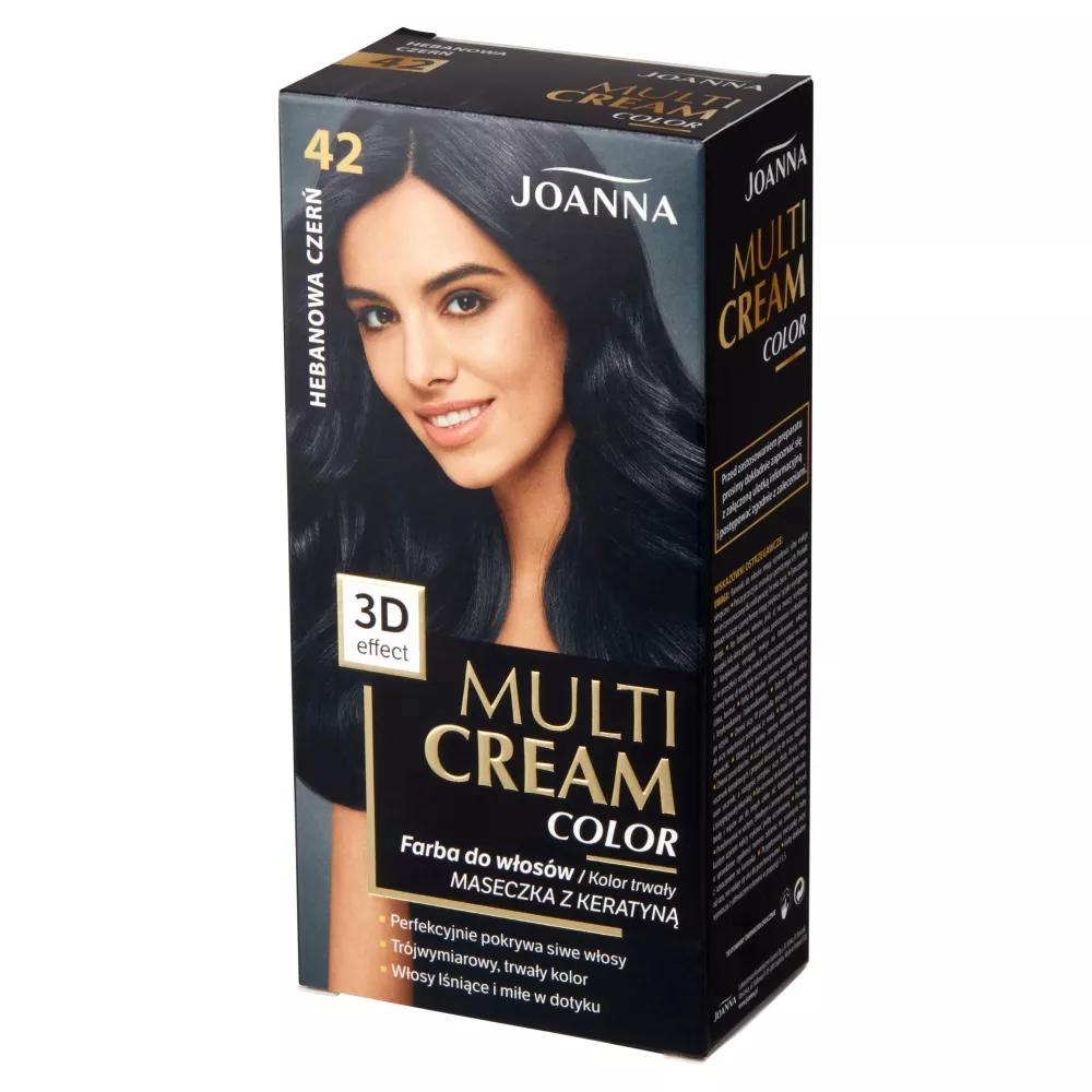 Joanna Multi Cream Color Farba do włosów hebanowa czerń 42 to doskonały wybór dla osób pragnących uzyskać trójwymiarowy efekt głębi oraz naturalną objętość włosów. Dzięki zaawansowanej formule farba zapewnia jeszcze piękniejszy i trwalszy kolor, który skutecznie pokrywa siwiznę. Sekretem pięknych włosów jest głęboki, bardziej nasycony i intensywny kolor bez śladów siwizny. Zastosowanie w farbie odpowiedniej kombinacji barwników pozwala na koloryzację 3D - wielotonową, mieniącą się refleksami i przenikającymi się barwami. Dzięki niej nawet cienkie włosy uwodzą objętością w rozmiarze XL. Produkt został przetestowany dermatologicznie i zapewnia trwały efekt koloryzacji na poziomie III.