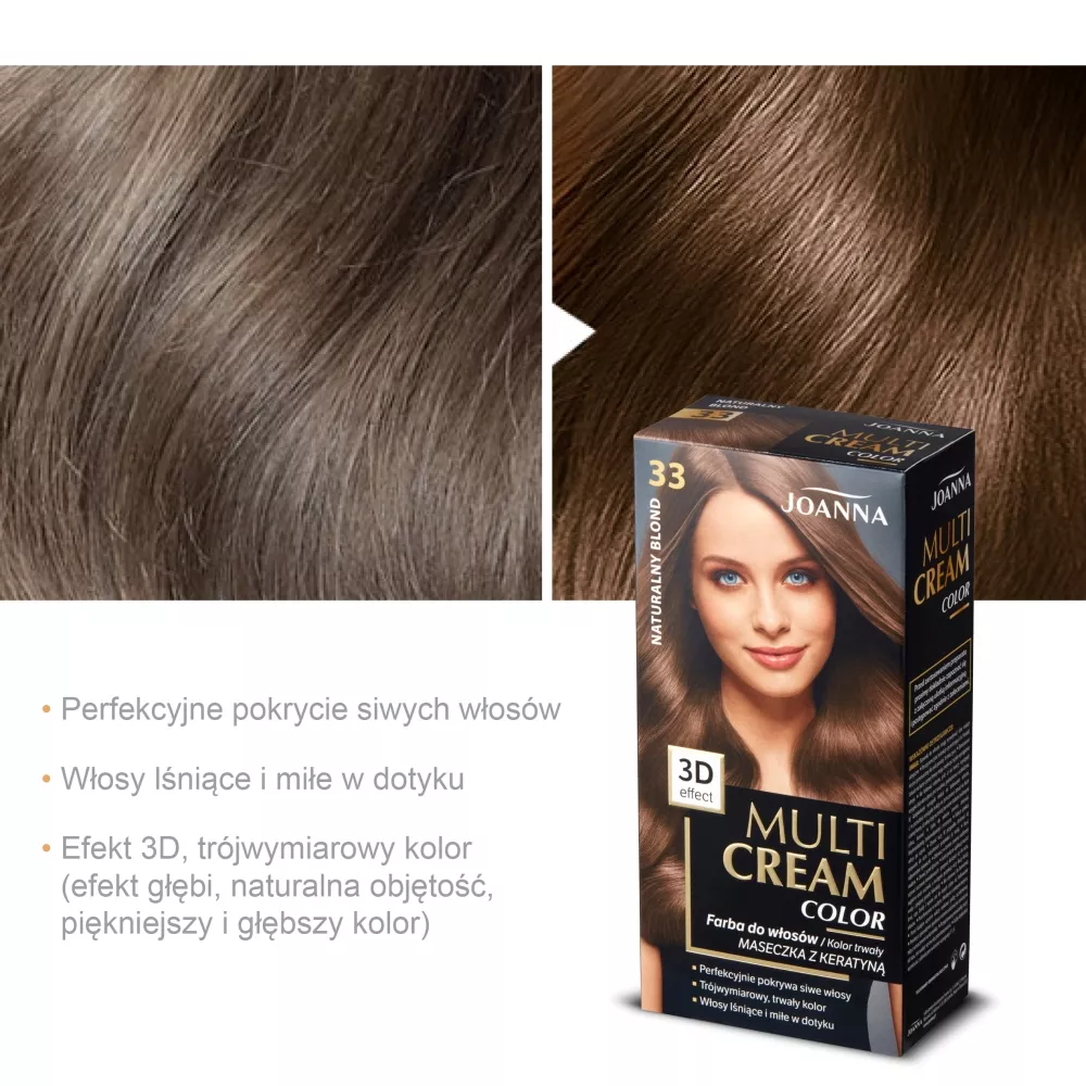 Joanna Multi Cream Color Farba do włosów naturalny blond 33 to produkt, który zapewnia trójwymiarowy efekt głębi oraz naturalną objętość, nadając Twoim włosom jeszcze piękniejszy i trwalszy kolor. Sekretem pięknych włosów jest głęboki, bardziej nasycony i intensywny kolor bez śladów siwizny. Dzięki odpowiedniej kombinacji barwników, farba umożliwia koloryzację 3D - wielotonową, pełną mieniących się refleksów i przenikających się barw. Idealna nawet dla cienkich włosów, które zyskują objętość w rozmiarze XL.