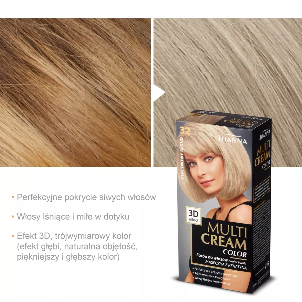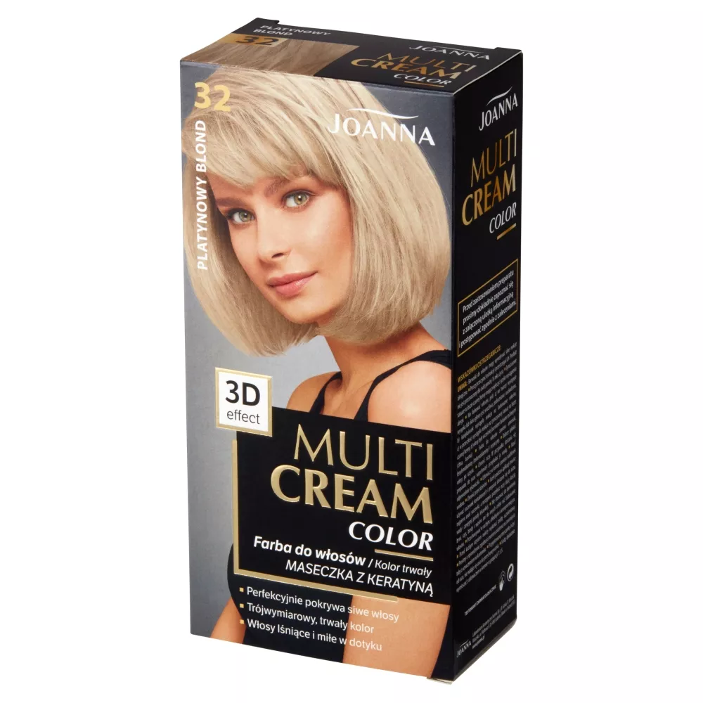 Odkryj sekret pięknych włosów z farbą Joanna Multi Cream Color w odcieniu platynowego blondu 32. Dzięki innowacyjnej koloryzacji 3D uzyskasz trójwymiarowy efekt głębi i naturalną objętość. Ciesz się bardziej nasyconym i intensywnym kolorem, który skutecznie pokrywa siwiznę.