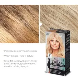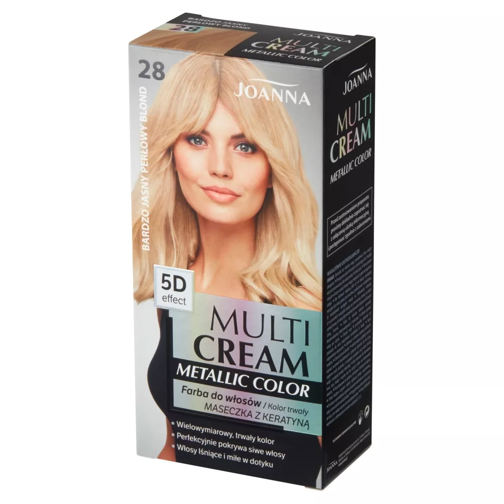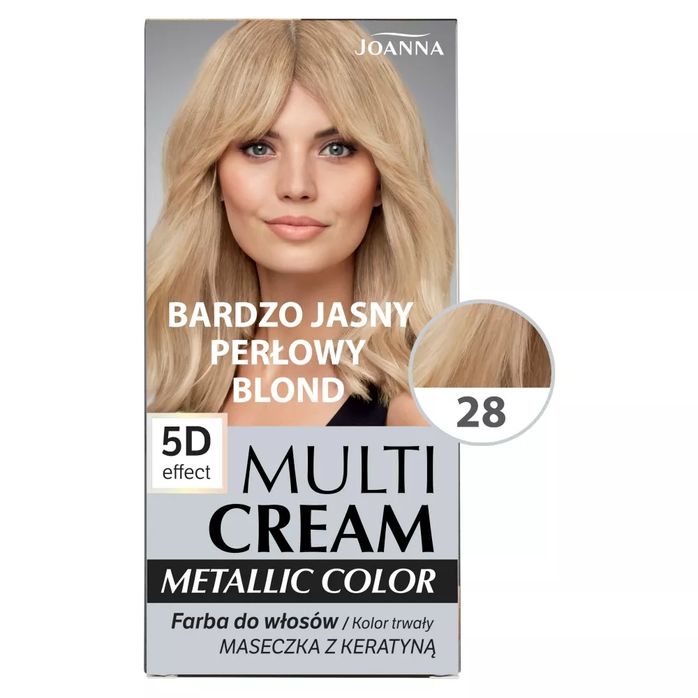 Joanna Multi Cream Metallic Color Farba do włosów w odcieniu bardzo jasnego perłowego blondu 28 to innowacyjna farba, która zapewnia włosom wielowymiarowy efekt głębi i chłodny, metaliczny połysk. Formuła wzbogacona o kompozycję barwników tworzy efekt koloryzacji 5D, dzięki czemu światło przenika wszystkie warstwy włosów, dodając im blasku i eliminując ślady siwizny. Produkt gwarantuje trwały kolor na poziomie III, a jego bezpieczeństwo potwierdzono testami dermatologicznymi.