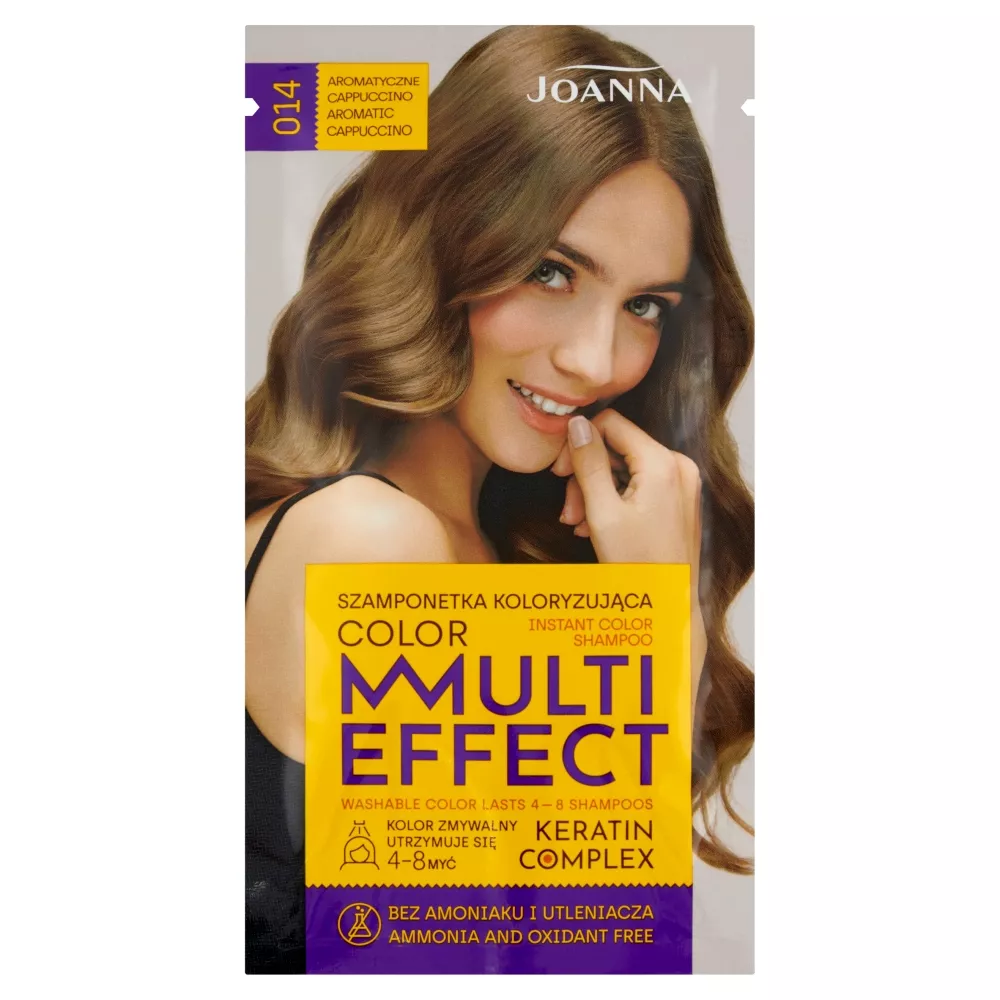 Joanna Multi Effect color Szamponetka koloryzująca w odcieniu aromatycznego cappuccino to doskonały wybór dla osób pragnących odświeżyć kolor włosów na kilka myć. Produkt jest polecany dla włosów od średniego blondu do jasnego brązu. Jego formuła jest wolna od amoniaku i utleniaczy, dzięki czemu jest delikatniejsza dla włosów. Kolor utrzymuje się od 4 do 8 myć, a jego intensywność i trwałość zależą od wyjściowego koloru i kondycji włosów.