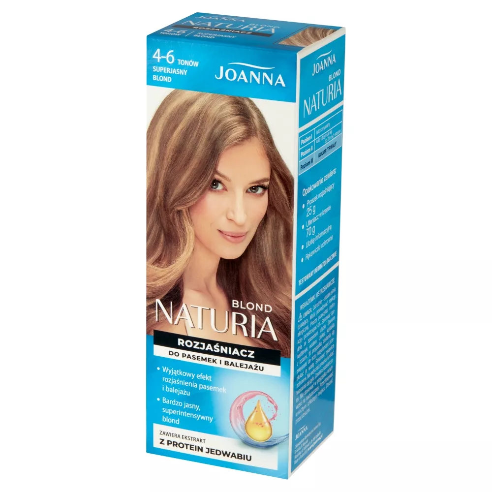 Efektowny balejaż i świetliste pasemka blond teraz w zasięgu Twojej ręki dzięki rozjaśniaczowi Joanna Naturia blond. Ten produkt zdobył zaufanie milionów kobiet, umożliwiając rozjaśnienie włosów nawet o 6 tonów, spełniając marzenia o pięknych, świetlistych pasemkach i modnym balejażu.