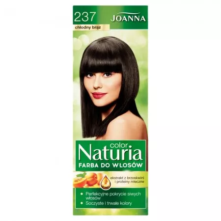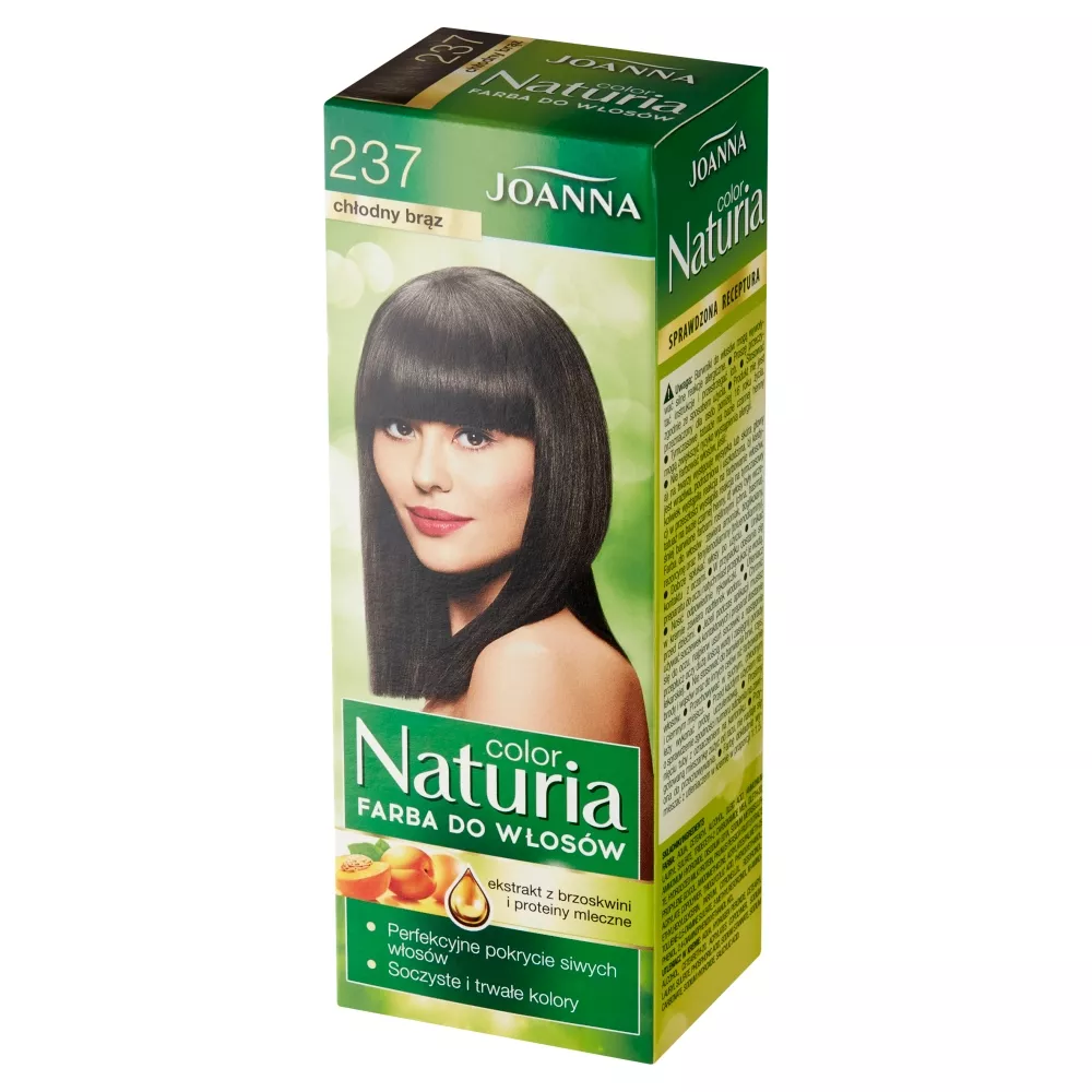 Joanna Naturia Color Farba do włosów w odcieniu chłodnego brązu 237 zdobyła uznanie wśród milionów kobiet, które marzą o głębokim i atrakcyjnym kolorze włosów. Dzięki tej farbie Twoje włosy będą wyglądały pięknie i błyszcząco przez długi czas, a po siwych włosach nie zostanie ani ślad.