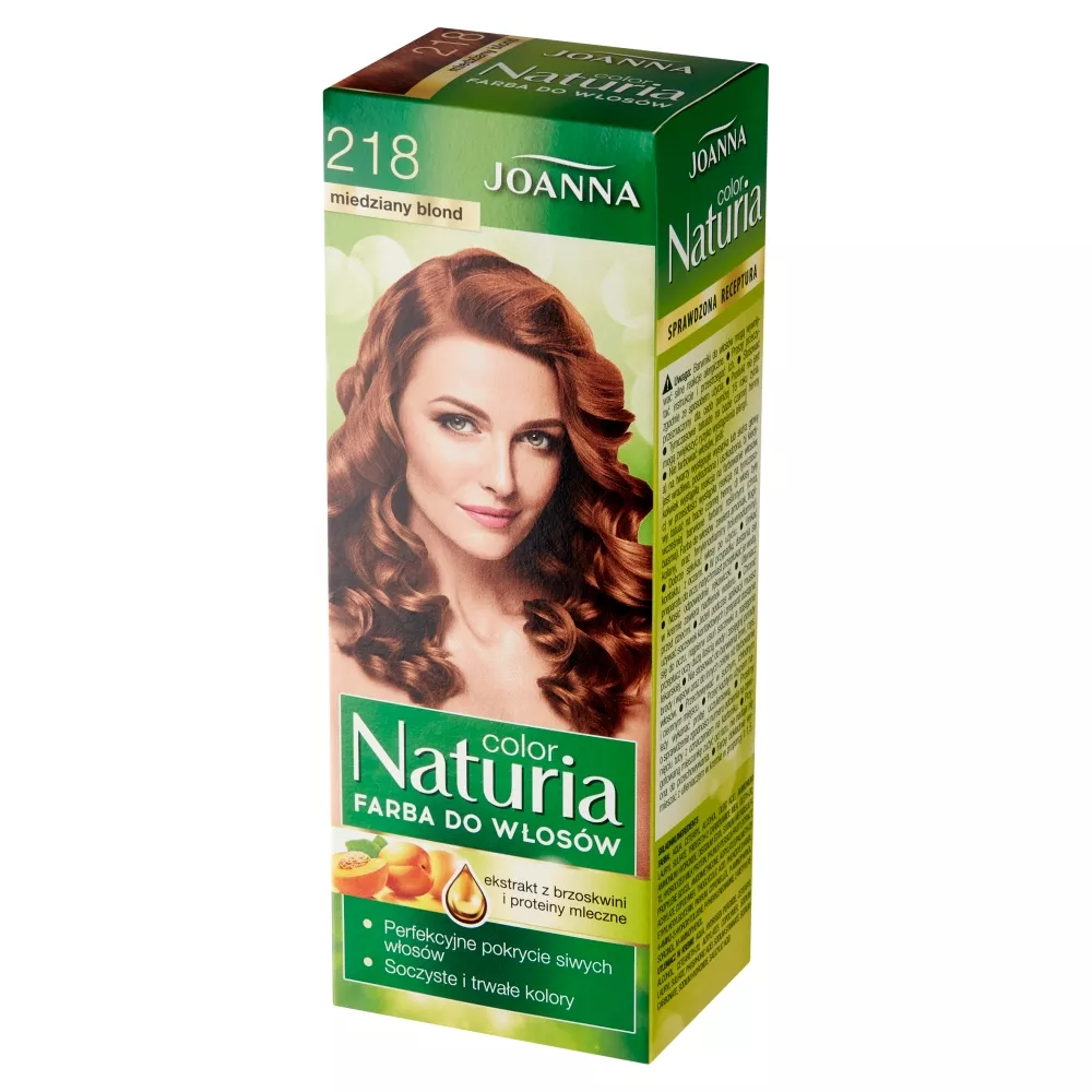 Joanna Naturia Color Farba do włosów miedziany blond 218 to produkt, który zdobył uznanie wśród milionów kobiet. Dzięki niej możesz spełnić marzenia o atrakcyjnym i głębokim odcieniu włosów. Farba zapewnia wyjątkowo piękne i błyszczące włosy, a po siwiźnie zostaje tylko wspomnienie. Receptura wzbogacona o odżywczy ekstrakt z brzoskwini i proteiny mleczne sprawia, że włosy po farbowaniu są miękkie, sprężyste i zdrowo wyglądają.