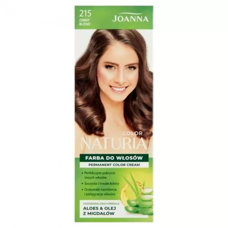 Joanna Naturia Color Farba do włosów zimny blond 215 to produkt, który łączy maksymalny efekt koloryzacji z pielęgnacją włosów w jednym zabiegu. Dzięki udoskonalonej formule zapewnia trwałe i modne odcienie oraz doskonałe pokrycie siwizny. Receptura farby głęboko odżywia i nawilża włosy podczas farbowania.