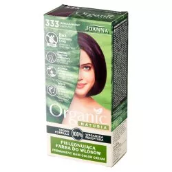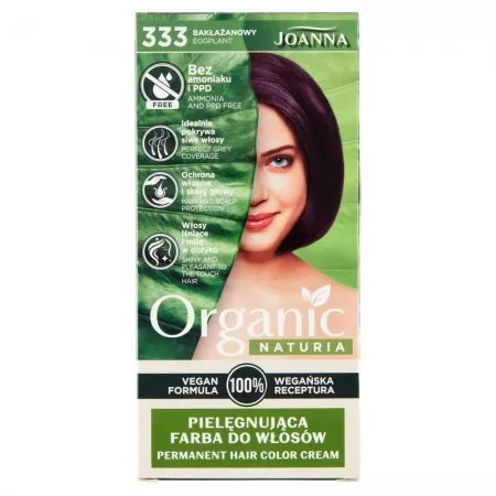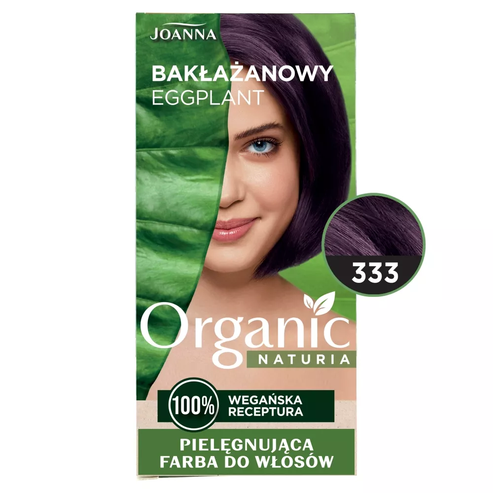 Joanna Naturia Organic Pielęgnująca farba do włosów w odcieniu bakłażanowy 333 to zaawansowana, trwała koloryzacja na poziomie III, która łączy w sobie skuteczność z delikatnością dla włosów i skóry głowy. Opracowana w 100% z wegańskich składników, farba nie zawiera substancji drażniących, takich jak amoniak i PPD.