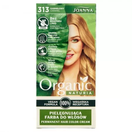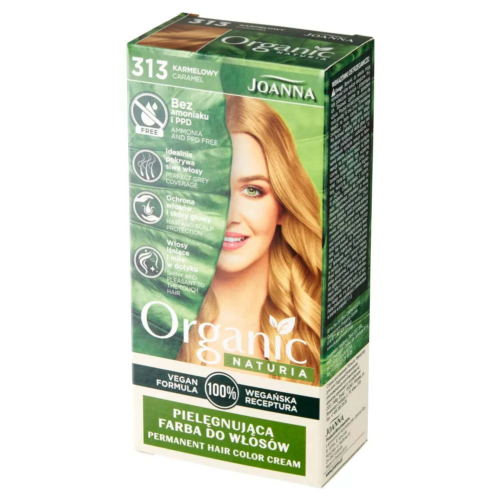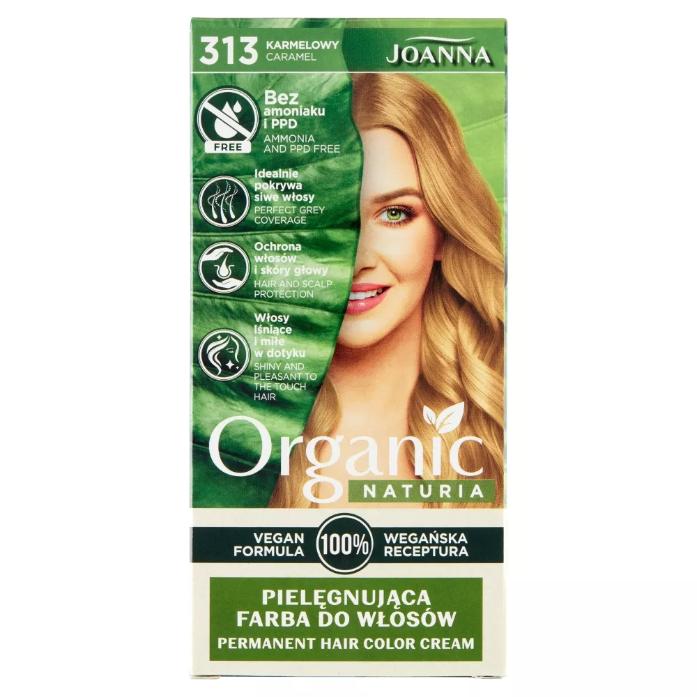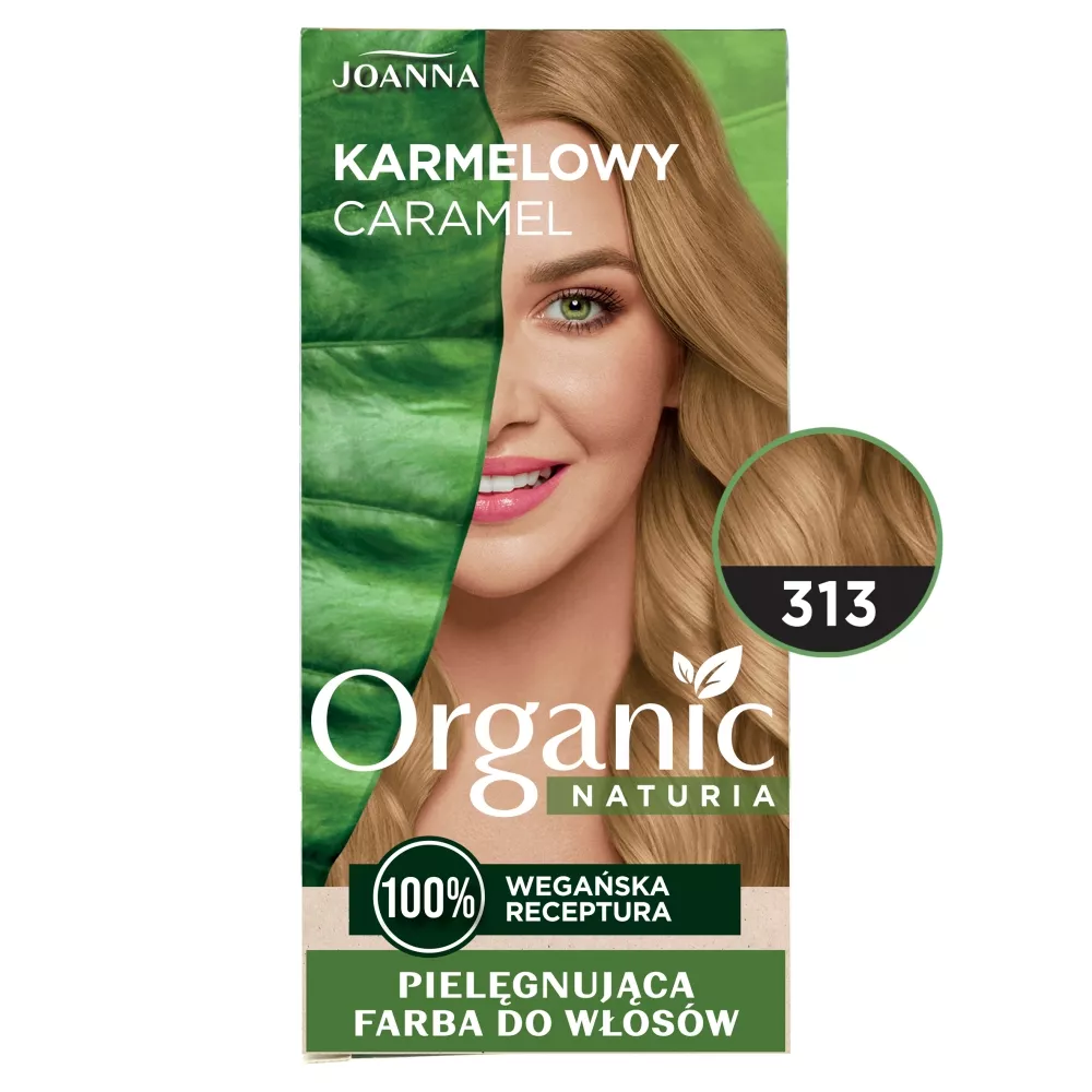 Joanna Naturia Organic Pielęgnująca Farba do Włosów w odcieniu karmelowym 313 to innowacyjna farba stworzona z myślą o osobach poszukujących trwałego koloru i delikatnej pielęgnacji. Nasza farba działa na poziomie III, co oznacza, że zapewnia długotrwały efekt koloryzacji. Dzięki nowoczesnej technologii, receptura jest w 100% wegańska i pozbawiona substancji drażniących, takich jak amoniak i PPD.