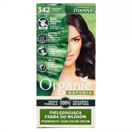 Joanna Naturia Organic Pielęgnująca farba do włosów w odcieniu kawowym 342 to doskonały wybór dla osób poszukujących trwałego koloru i delikatnej pielęgnacji. Dzięki zaawansowanej technologii, farba oferuje recepturę w 100% wegańską, wolną od amoniaku i PPD, co czyni ją idealną dla osób z wrażliwą skórą głowy.