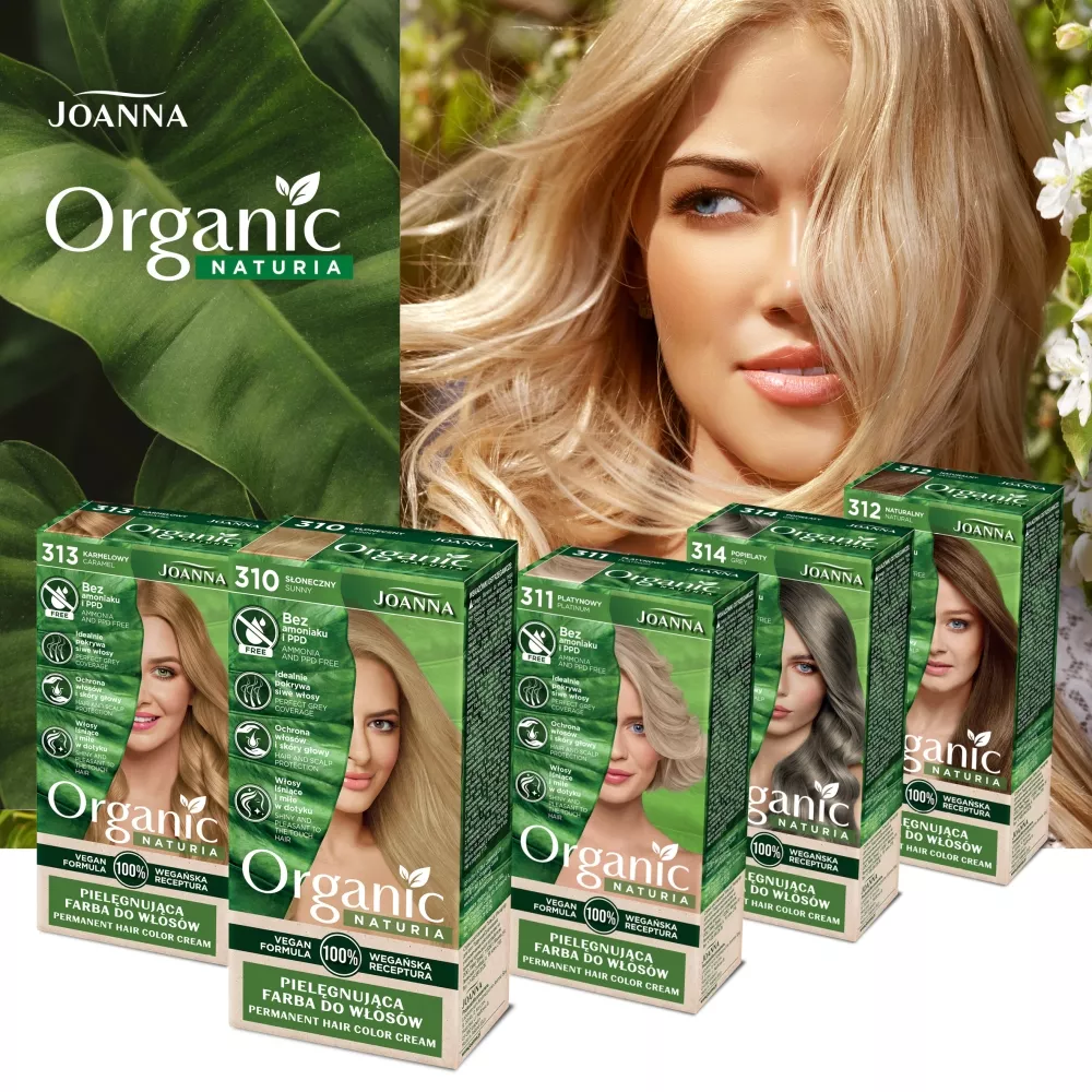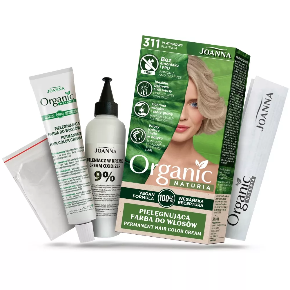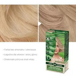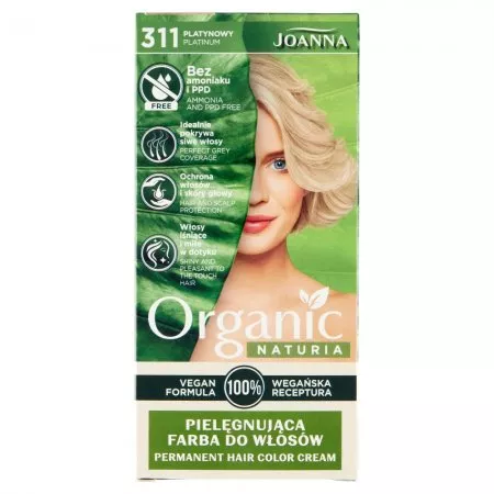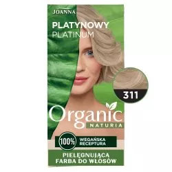 Joanna Naturia Organic Pielęgnująca farba do włosów platynowy 311 to innowacyjna farba stworzona w technologii, która zapewnia 100% wegańską recepturę. Produkt nie zawiera drażniących substancji takich jak amoniak i PPD, dzięki czemu jest idealnym wyborem dla osób z wrażliwą skórą głowy. Farba zapewnia trwały kolor na poziomie III, jednocześnie dbając o zdrowie włosów i skóry głowy.
