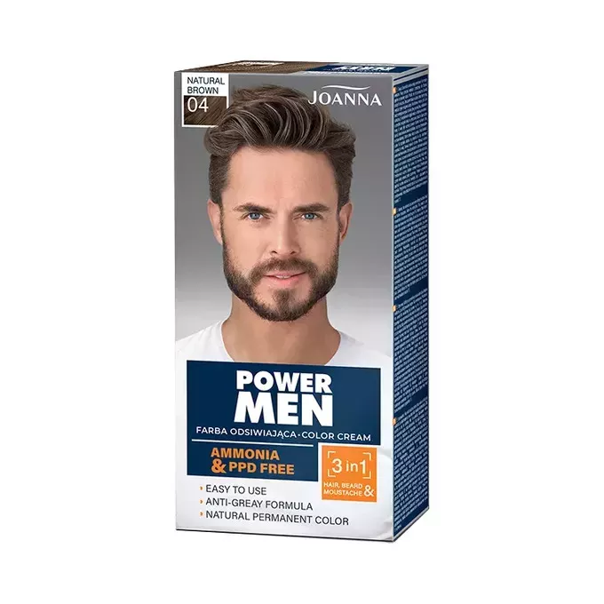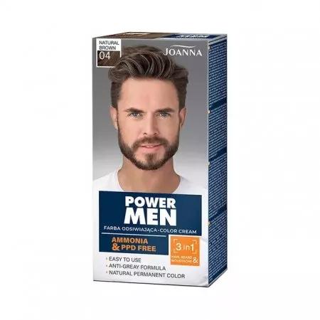 Joanna Power Men Color Cream Farba 04 Natural Brown to farba stworzona specjalnie dla mężczyzn, oferująca natychmiastowe i trwałe pokrycie siwych włosów. Kilka minut wystarczy, aby uzyskać dyskretny i naturalny efekt koloryzacji na głowie, brodzie czy wąsach. Dzięki specjalnej buteleczce z aplikatorem, aplikacja jest niezwykle prosta: nałóż, pozostaw i spłucz.