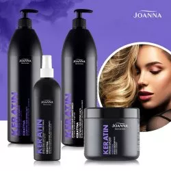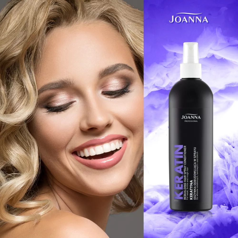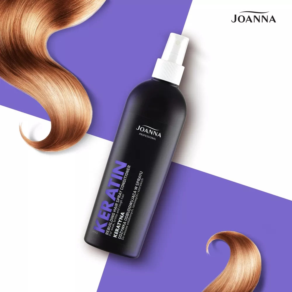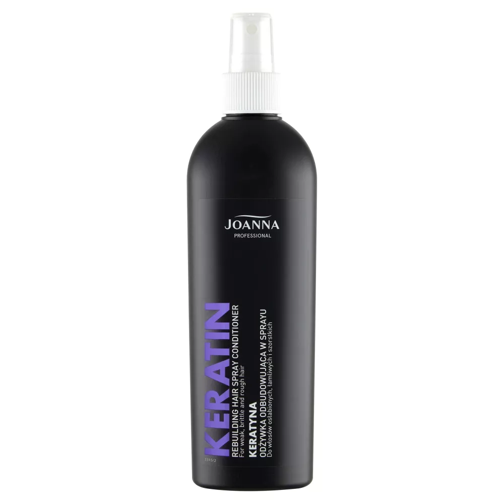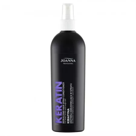Odżywka w sprayu do włosów z keratyną Joanna Professional została specjalnie opracowana do stosowania w salonach fryzjerskich. Polecana jest do pielęgnacji włosów osłabionych zabiegami fryzjerskimi, łamliwych, szorstkich i trudno rozczesujących się. Kosmetyk ułatwia rozczesywanie, a zawarty kompleks keratynowy o właściwościach odbudowujących włókna włosów sprawia, że odzyskują elastyczność, sprężystość i siłę.