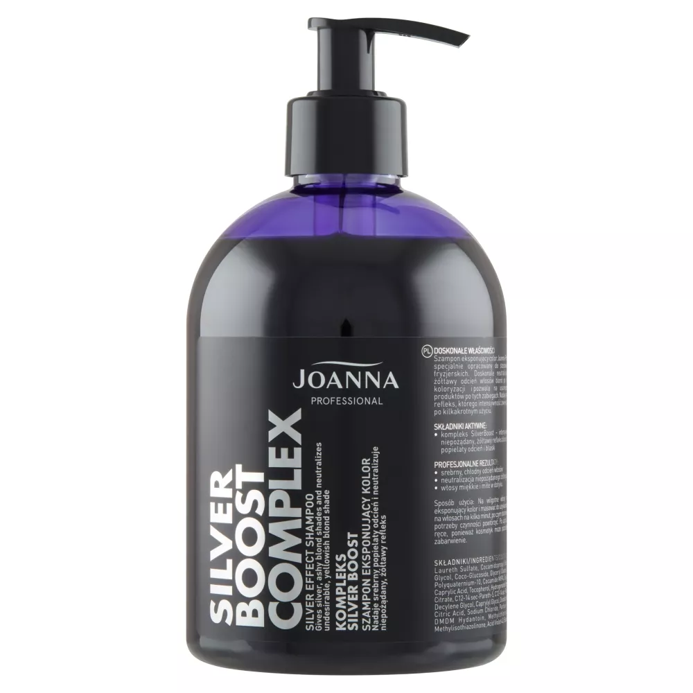 Szampon eksponujący color Joanna Professional został specjalnie opracowany do stosowania w salonach fryzjerskich. Doskonale neutralizuje niepożądany, żółtawy odcień włosów blond po rozjaśnianiu lub koloryzacji i pozwala na usunięcie pozostałości produktów po tych zabiegach. Nadaje srebrny, popielaty refleks, którego intensywność zwiększa się stopniowo po kilkakrotnym użyciu.