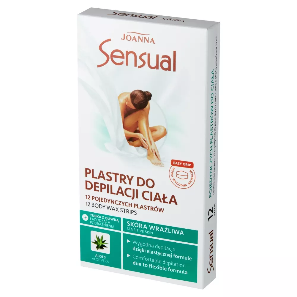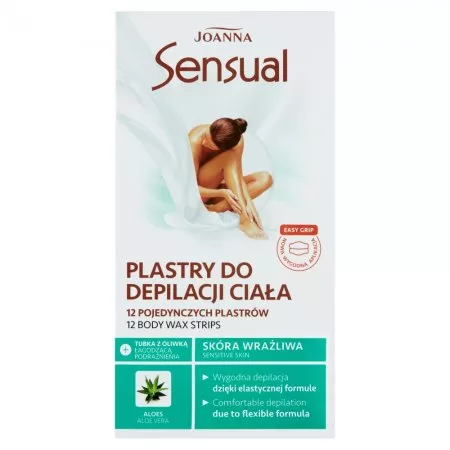 Odkryj skuteczność i komfort depilacji dzięki Joanna Sensual Plastry do depilacji ciała. Zestaw zawiera 12 plastrów i tubkę z oliwką łagodzącą 10 ml, które zapewniają aksamitnie gładką skórę na dłużej. Plastry z woskiem Sensual wykorzystują specjalną formułę wzbogaconą wyciągiem z aloesu, znanym z właściwości kojących i nawilżających. Dzięki elastycznemu kształtowi, łatwo dopasowują się do konturów ciała, usuwając zbędne owłosienie razem z cebulkami jednym ruchem.