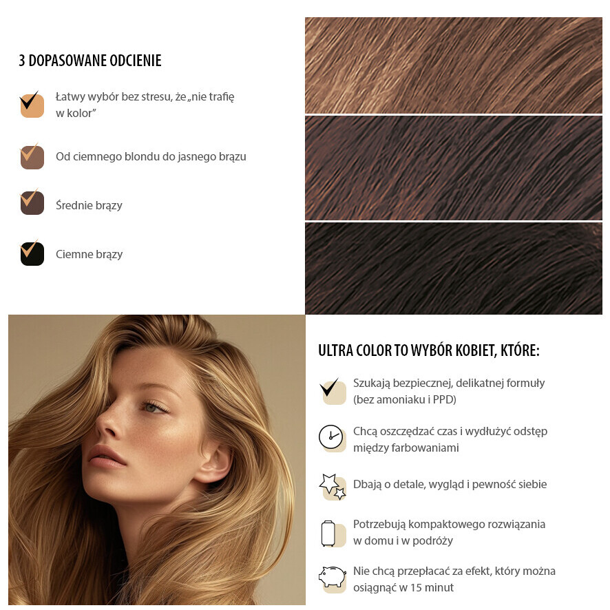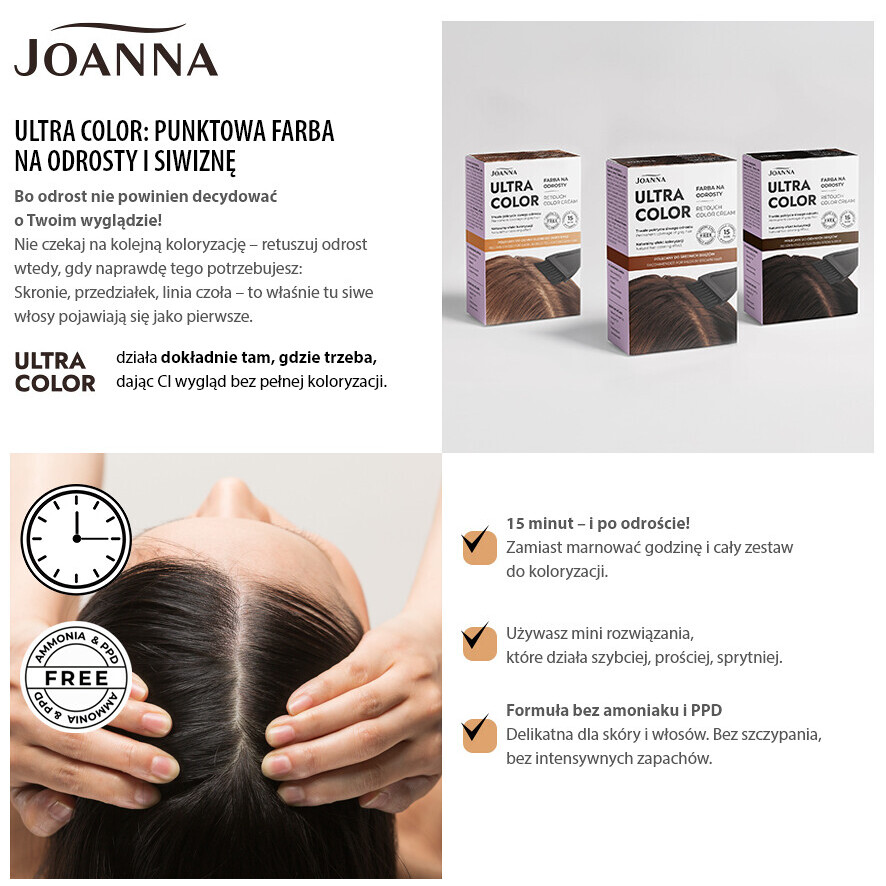 Joanna Ultra Color to innowacyjna farba na odrosty, stworzona z myślą o szybkim i skutecznym retuszu odrostów od ciemnego blondu do jasnego brązu. Teraz możesz zatuszować siwe włosy w zaledwie 15 minut, bez konieczności pełnej koloryzacji i marnowania całego zestawu! Formuła bez amoniaku i PPD jest delikatna dla skóry głowy i włosów, nie powoduje szczypania i nie wydziela intensywnych zapachów. To doskonałe rozwiązanie dla wszystkich, którzy chcą cieszyć się pięknym kolorem i naturalnym wyglądem w każdej chwili!