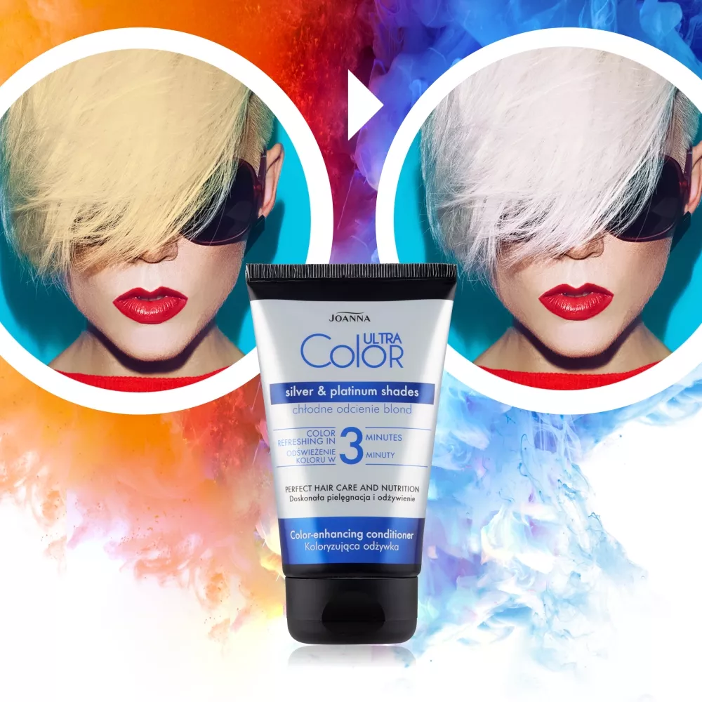 Joanna Ultra Color Koloryzująca odżywka dla chłodnych odcieni blond to idealne rozwiązanie dla osób pragnących zmienić lub odświeżyć kolor swoich włosów bez użycia amoniaku i wody utlenionej. Dzięki starannie dobranej kompozycji składników kondycjonujących i barwników, odżywka zapewnia intensywny i świetlisty odcień już w 3 minuty. Efekt koloryzacji utrzymuje się do 3-4 myć, stopniowo wypłukując się.