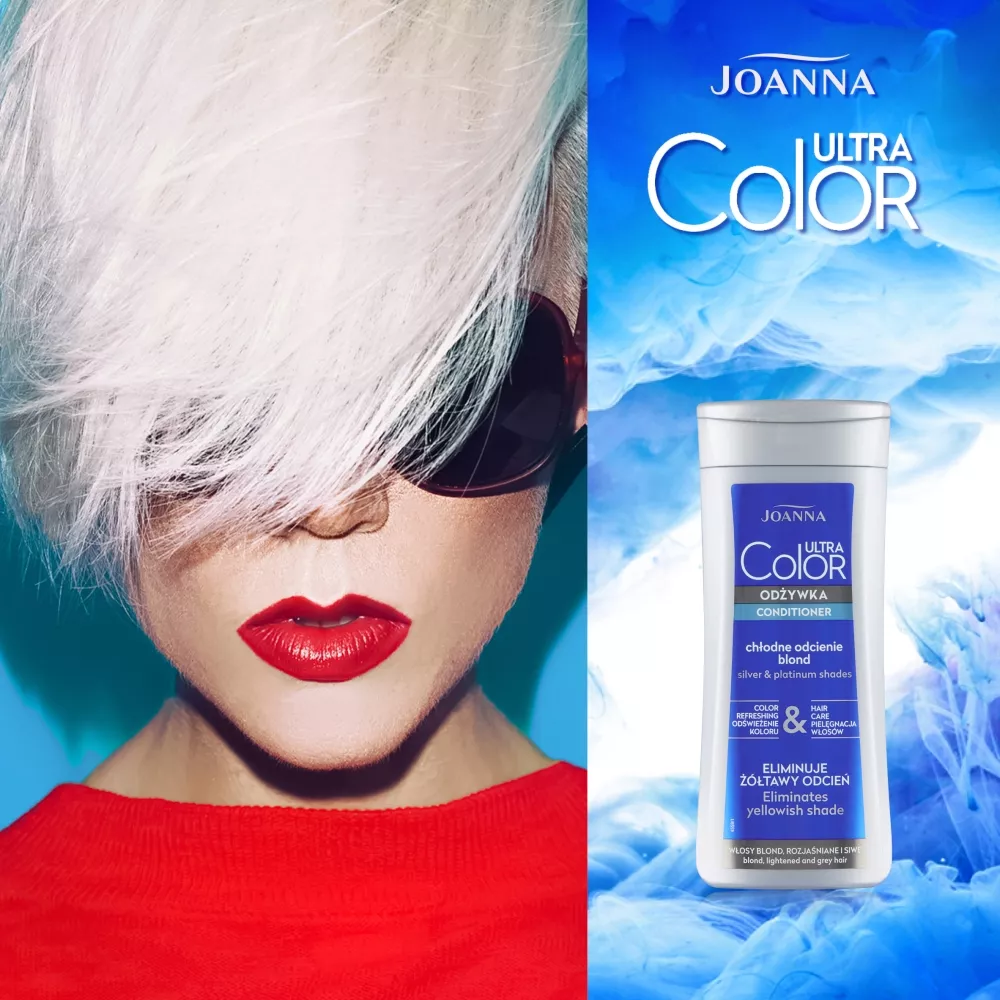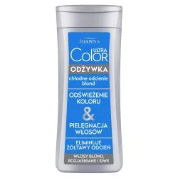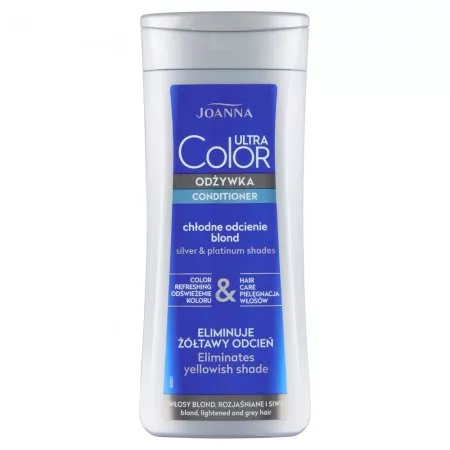 Joanna Ultra Color Odżywka chłodne odcienie blond to doskonała propozycja dla osób pragnących podkreślić blask swoich włosów. Dzięki zawartości składników kondycjonujących i nawilżających, odżywka skutecznie zapobiega elektryzowaniu się włosów i ułatwia ich rozczesywanie. Wyselekcjonowane barwniki, obecne w formule, nadają włosom wymarzony odcień i neutralizują żółtawe tony, co sprawia, że produkt jest idealny zarówno dla włosów blond, jak i siwych.