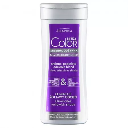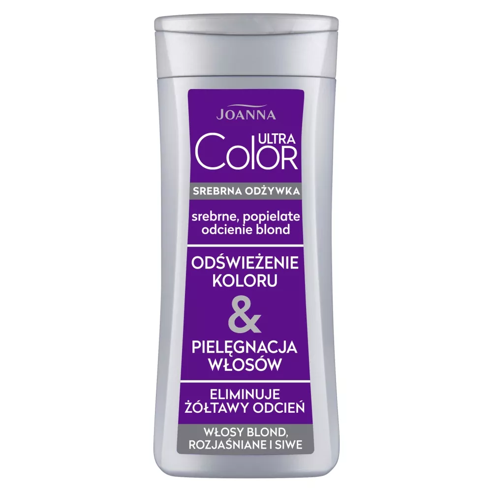 Joanna Ultra Color Srebrna odżywka to doskonały wybór dla osób pragnących nadać swoim włosom srebrne, popielate odcienie blond. Dzięki zawartości składników kondycjonujących i nawilżających, odżywka zapobiega elektryzowaniu się włosów oraz ułatwia ich rozczesywanie. Wyselekcjonowane barwniki zawarte w formule produktu pozwalają na neutralizację żółtawego odcienia, nadając włosom blask i wymarzony kolor już po kilkakrotnym zastosowaniu. Produkt jest również idealny do włosów siwych, ożywiając ich połysk i przywracając naturalne piękno.