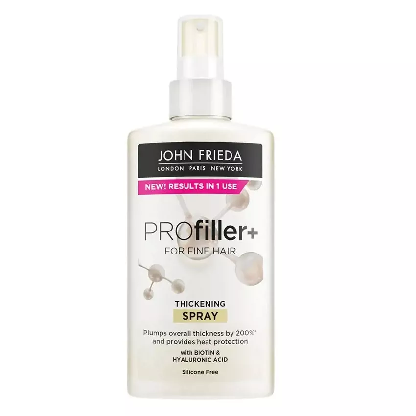 John Frieda PROfiller+ Thickening Spray to idealne rozwiązanie dla osób z cienkimi i delikatnymi włosami. Ten zagęszczający lakier do włosów sprawia, że pasma stają się nawet o 200% grubsze, jednocześnie wzmacniając je i czyniąc mniej podatnymi na łamanie. Formuła wzbogacona biotyną i kwasem hialuronowym nie tylko pogrubia włosy, ale także zapewnia lekkie utrwalenie oraz ochronę przed wysoką temperaturą do 200°C. Po użyciu włosy są grubsze, pełne objętości i gotowe do stylizacji.