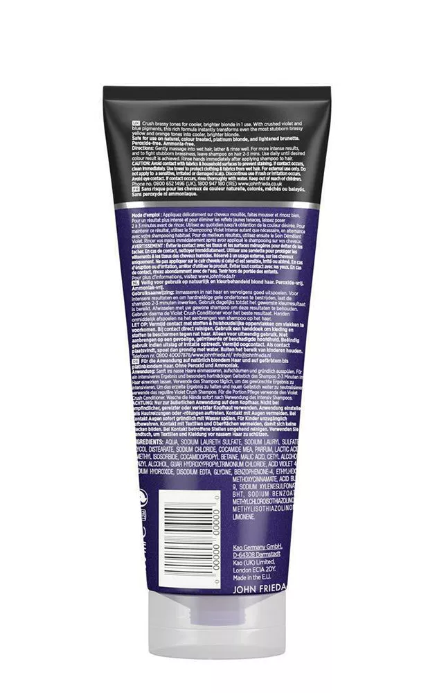 John Frieda Violet Crush to fioletowy szampon do włosów blond, który szybko i skutecznie ochładza kolor jasnych włosów, eliminując żółte tony. Już po jednej aplikacji możesz cieszyć się chłodniejszym odcieniem blondu. Szampon ten jest odpowiedni dla każdego rodzaju blondu: naturalnego, farbowanego, rozjaśnianego oraz pasemek.