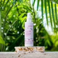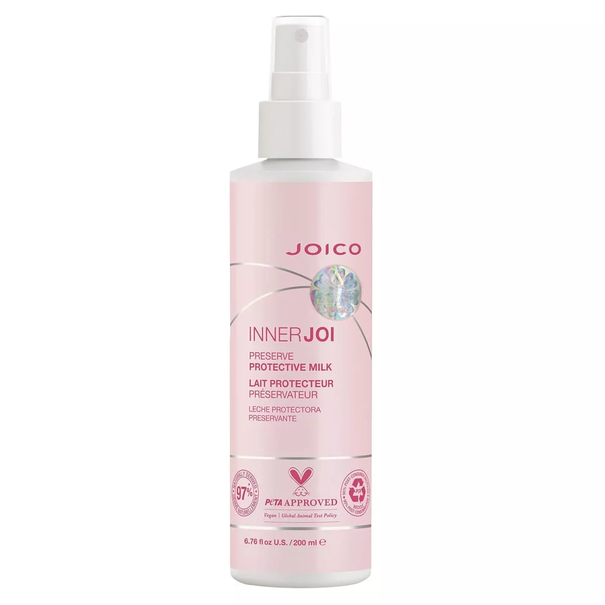 Joico InnerJoi Preserve Protective Milk to wegańskie mleczko do włosów koloryzowanych w sprayu bez spłukiwania z ekstraktem z buraka i olejkiem z pestek malin, które nadaje połysk włosom koloryzowanym i zapewnia ochronę termiczną do 232°C. Zawiera 97% składników pochodzenia naturalnego.
