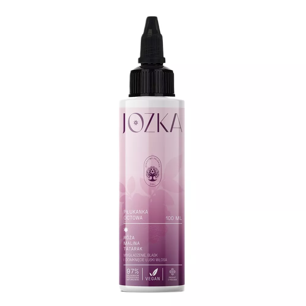 Ziołowo-octowa płukanka Jozka to doskonały wybór dla każdego typu włosów. Stworzona na bazie ekstraktu z 16 starannie dobranych roślin oraz delikatnego octu różanego, zapewnia wygładzenie łusek włosa, nadając im blask i miękkość. Zawartość ekstraktów ziołowych wzmacnia cebulki włosów i skórę głowy, a jej wyjątkowy, malinowy aromat zamienia pielęgnację w prawdziwą przyjemność. Produkt zawiera aż 97% składników pochodzenia naturalnego.