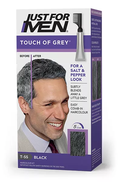Just For Men® Touch of Grey to specjalistyczny preparat odsiwiający, stworzony specjalnie dla męskich włosów. Zapewnia stopniowe przywrócenie naturalnego koloru, nie powodując efektu koloryzacji, zachowuje delikatny efekt pieprzu i soli. Just For Men® zawiera pigmenty, podobne do naturalnych, które włosy absorbują naturalnie. Składniki repigmentacyjne wypełniają luki po naturalnym pigmencie w strukturze siwiejących włosów. a siwe włosy pokrywają się stopniowo kolorem, aż do ich całkowitego pokrycia. Nadaje siwym włosom ich naturalny wygląd, koloryzując je subtelnymi tonami.