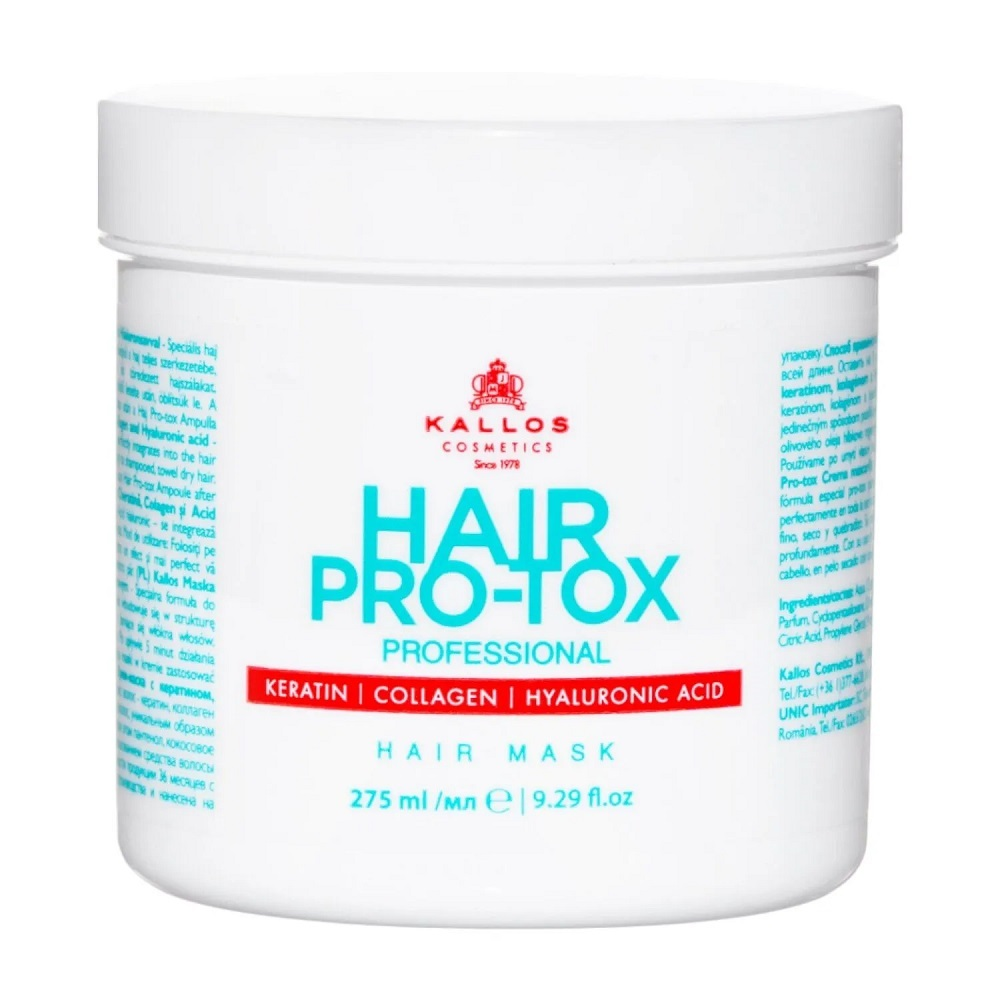 Kallos Hair Pro-Tox Hair Mask to intensywnie regenerująca maska do włosów suchych, zniszczonych i łamliwych. Dzięki unikalnej formule z keratyną, kolagenem i kwasem hialuronowym, produkt skutecznie odbudowuje strukturę włosów, wzmacniając je od wewnątrz i zapewniając głębokie nawilżenie. Zawartość pantenolu, oleju kokosowego oraz oliwy z oliwek sprawia, że włosy stają się odżywione, bardziej lśniące i jedwabiście gładkie w dotyku.