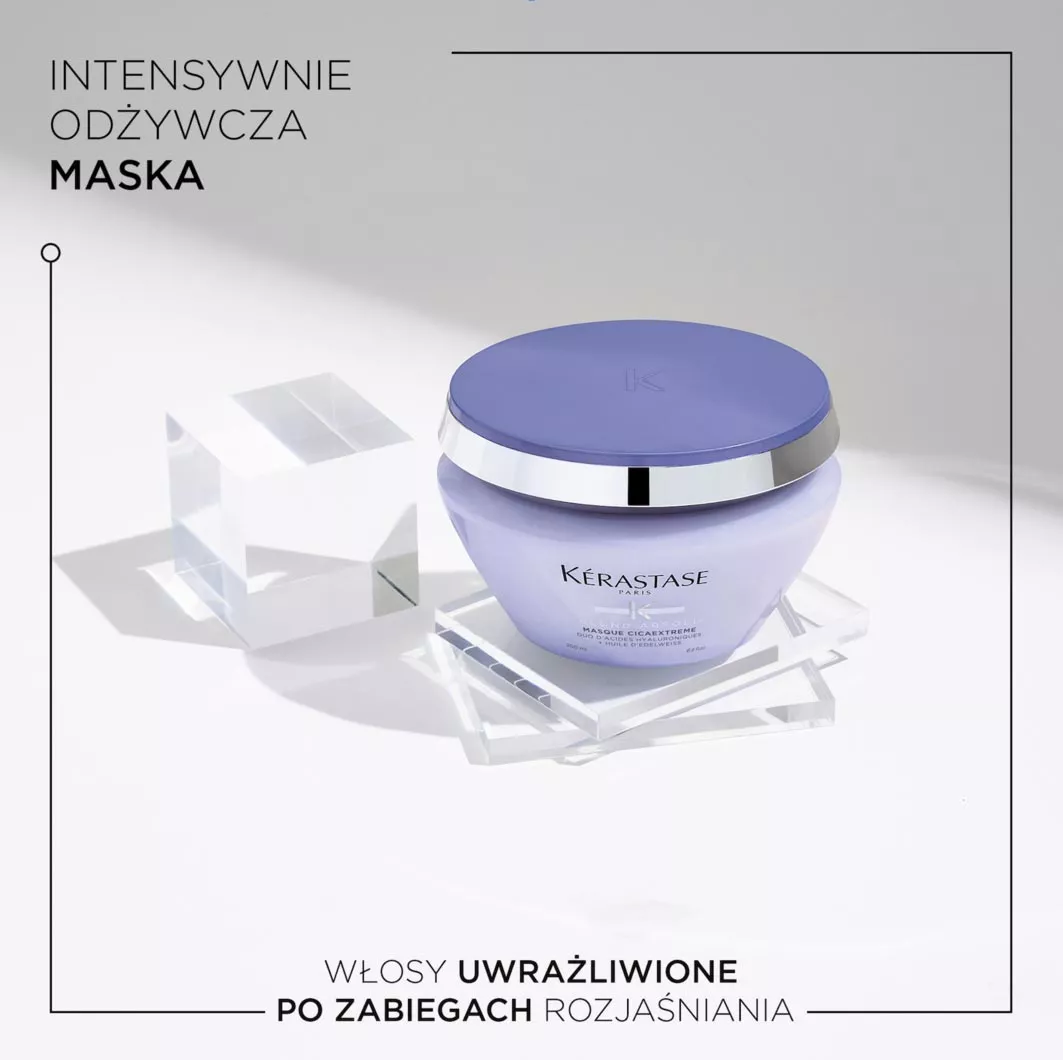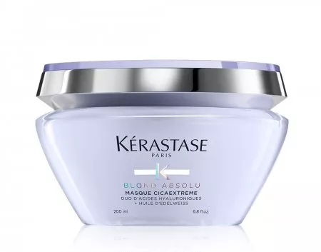 Włosy mocno rozjaśniane potrzebują specjalnej opieki. Mają tendencję do przesuszenia, bywają słabe i zniszczone. To z myślą o ekstremalnych blondach opracowano formułę maski Kerastase Blond Absolu Cicaextreme. Maska wnika głęboko we włosy i skutecznie je odbudowuje, przywracając blask, elastyczność i gładkość. Dzięki zawartości podwójnego kwasu hialuronowego i olejku z szarotki alpejskiej maska Cicaextreme ogranicza łamliwość i utrzymuje mocne i błyszczące blond włosy. Pasma są intensywnie nawilżone, mocniejsze i bardziej błyszczące.