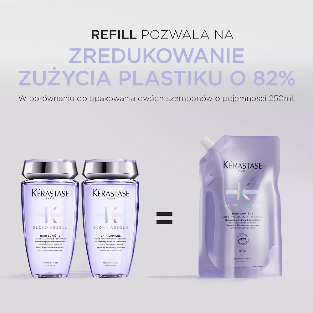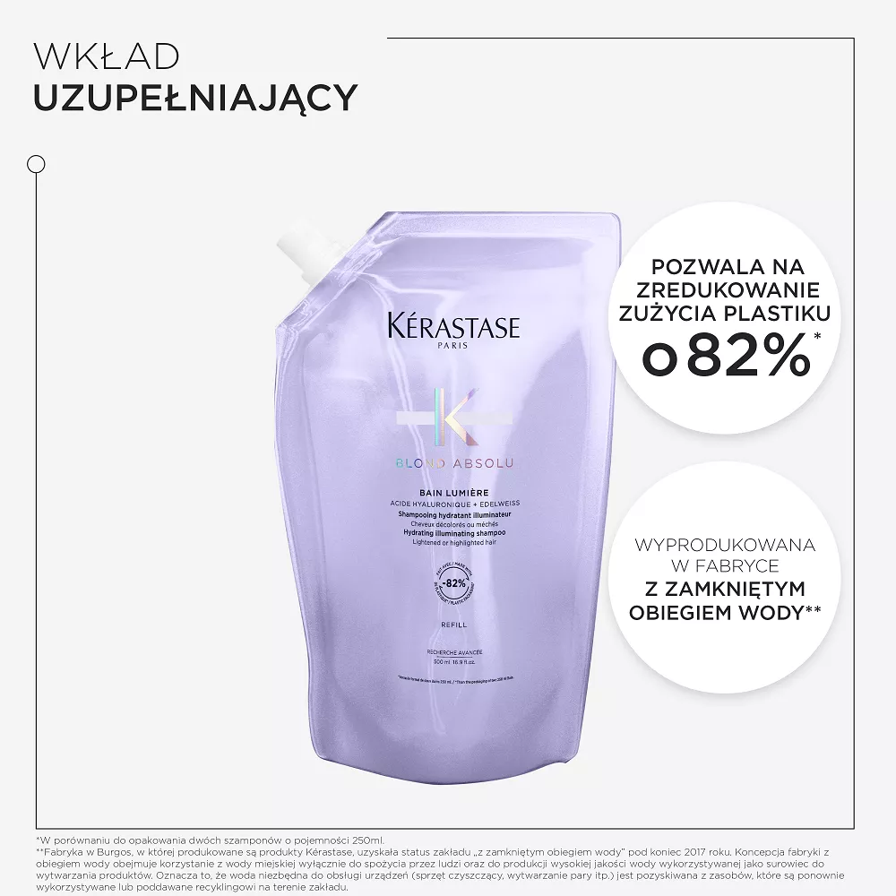 Butelka szamponu o pojemności 500ml do ponownego uzupełniania jest wykonana w 95% z plastiku pochodzącego z recyklingu* i wyprodukowana w fabryce ""z zamkniętym obiegiem wody”**, która osiągnęła 100% energii odnawialnej*** oraz z możliwością ponownego uzupełnienia wkładem uzupełniającym pozwalającym na zredukowanie zużycia plastiku o 82%****.