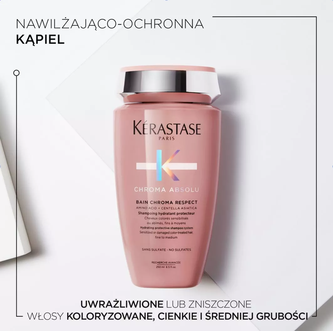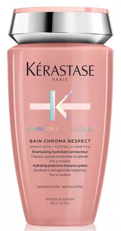 Szampon do włosów Kerastase Chroma Absolu dedykowany jest pielęgnacji włosów farbowanych, uwrażliwionych i zniszczonych - cienkich albo średniej grubości. Ten bladoróżowy krem intensywnie nawilża włosy i sprawia, że na nowo są cudownie miękkie w dotyku. Szampon redukuje porowatość włosów, co pozwala zachować intensywny kolor na dłużej - nawet na 6 tygodni. Szampon dodaje również włosom blasku i sprężystości. Lekka formuła delikatnie oczyszcza włosy.