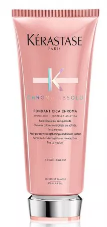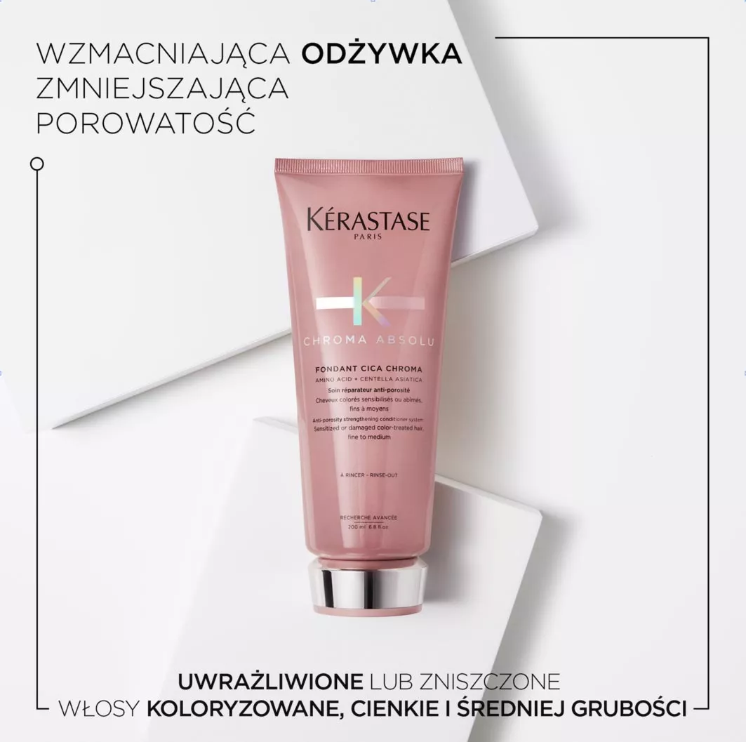 Odżywka do włosów Kerastase Chroma Absolu to idealne rozwiązanie, jeśli Twoje pasma są farbowane, uwrażliwione i zniszczone, są cienkie albo średniej grubości. Odżywka wzmacnia i przeciwdziała porowatości włosów. Zawiera aminokwas i wąkrotkę azjatycką. Kosmetyk wnika do rdzenia włosa i wzmacnia pasma od środka. Ponadto pozwala chronić włosy przed twardą wodą, uszkadzającą je i wypłukującą kolor. Włosy są odżywione, wyglądają zdrowo, a kolor zachowuje intensywność.