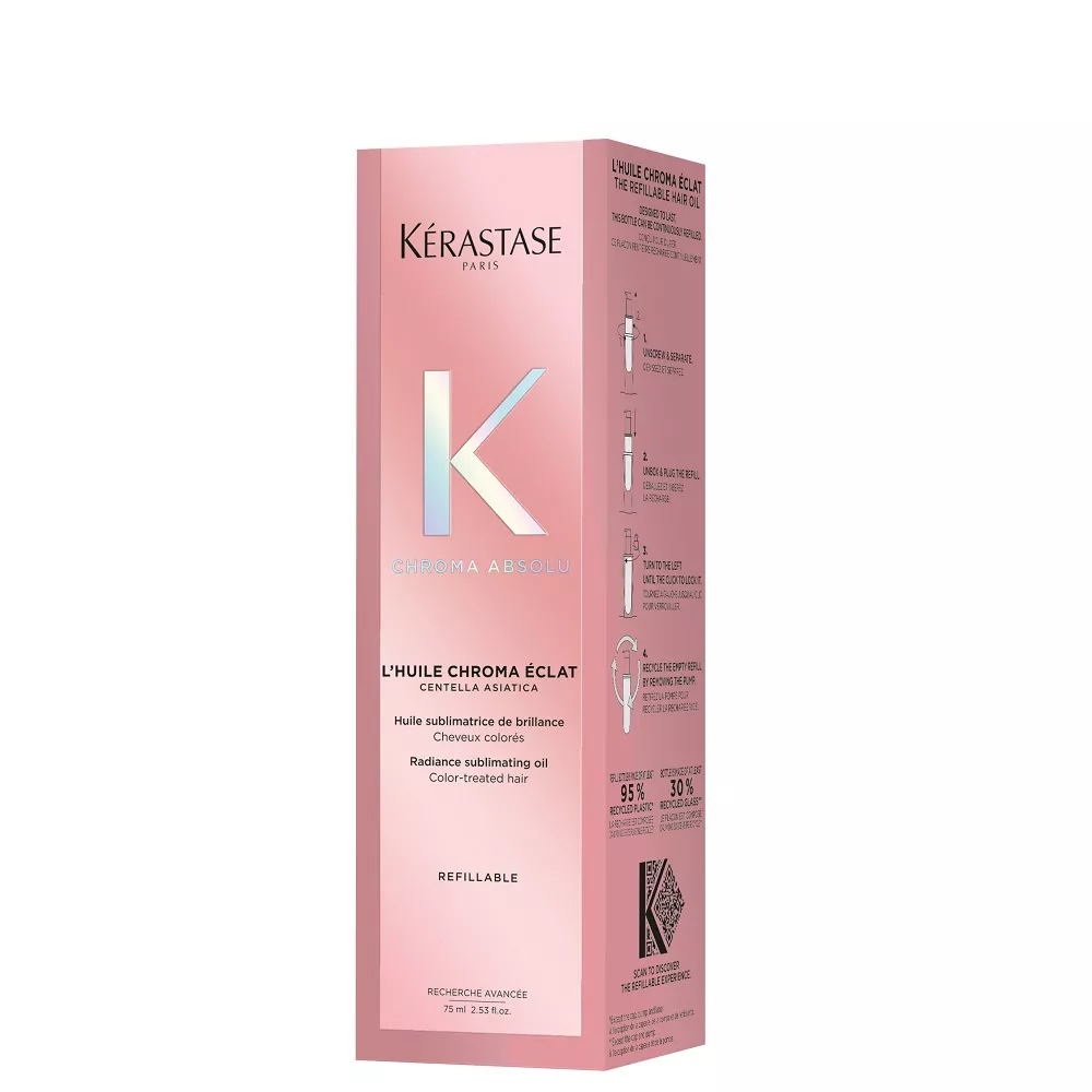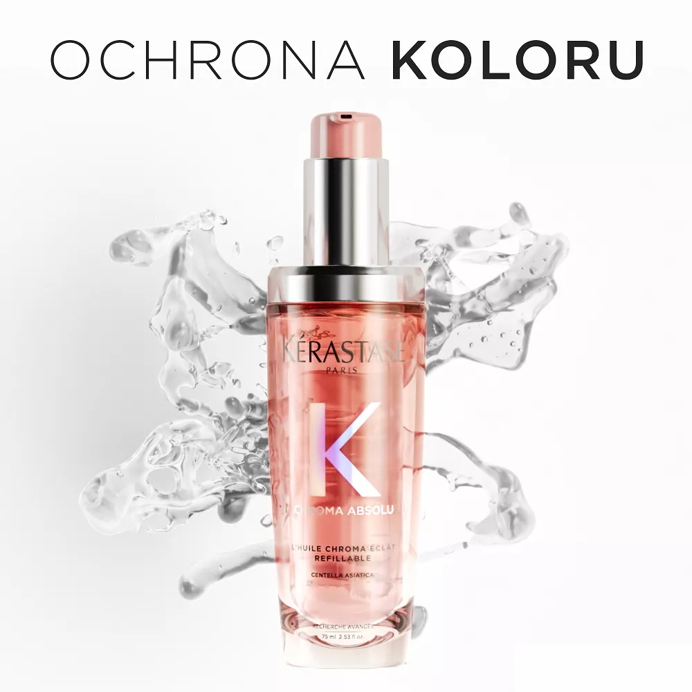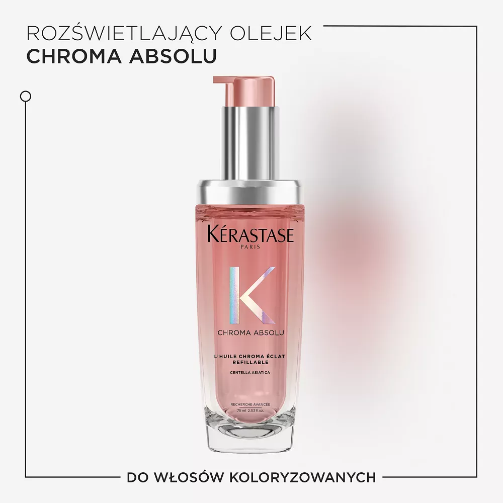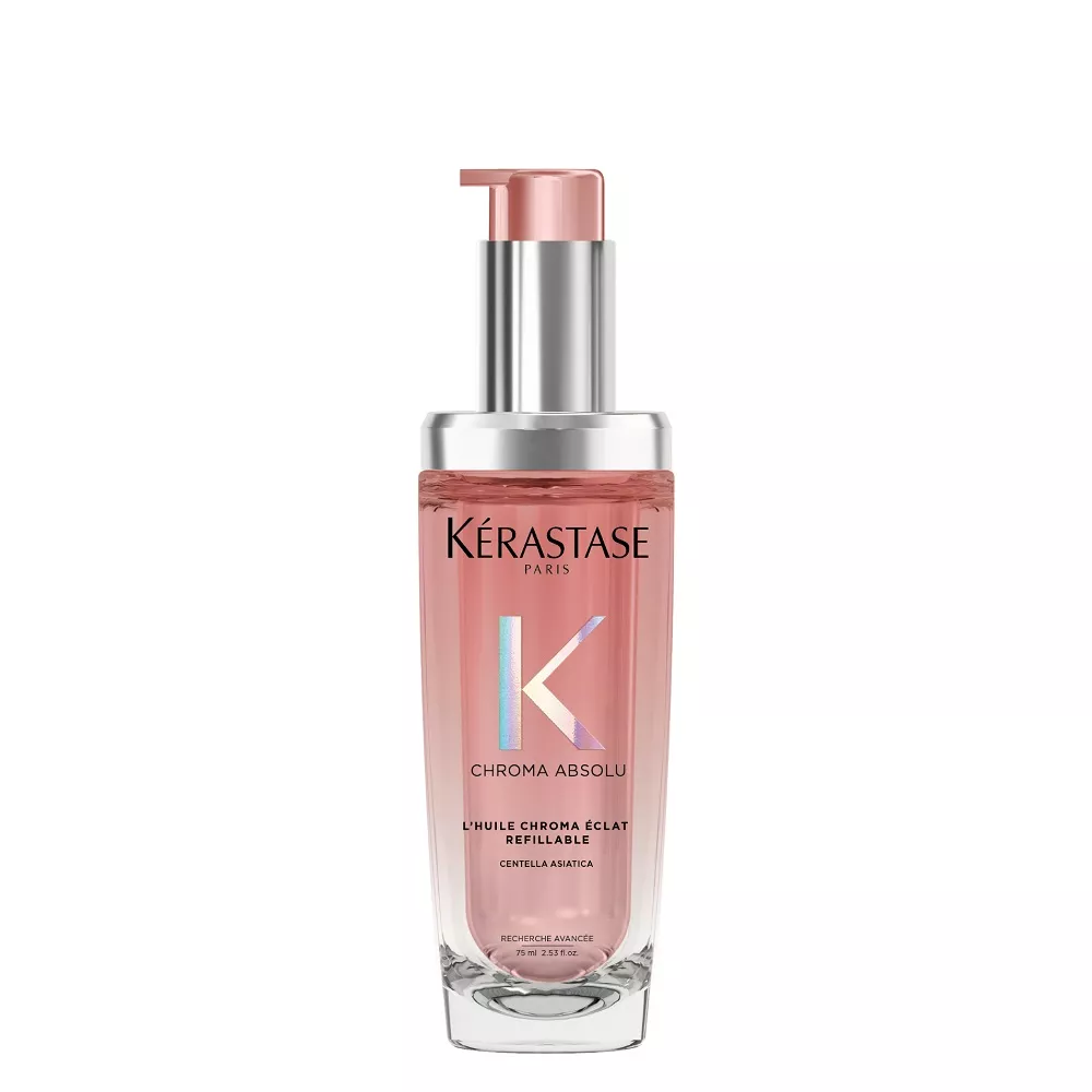 Olejek Chroma Absolu z możliwością ponownego uzupełniania nadaje długotrwały blask włosom farbowanym. Wzbogacony ekstraktem z wąkrotki azjatyckiej, rośliny dziko rosnącej w tropikalnym środowisku, chroni kolor włosów i sprawia, że emanują aurą uwodzicielskiego zapachu.