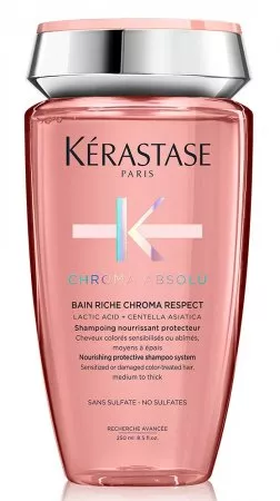 Szampon do włosów Kerastase Chroma Absolu jest dedykowany pielęgnacji włosów koloryzowanych uwrażliwionych bądź zniszczonych, średnich albo grubych. Kosmetyk transformuje powierzchnię włosów zapewniając im natychmiastową miękkość i redukując puszenie. Włosy są odżywione, a zmniejszenie ich porowatości sprawia, że kolor wolniej się wypłukuje. Ponadto szampon ożywia kolor i zapewnia większy połysk. Bogata formuła oczyszcza i odżywia włosy.