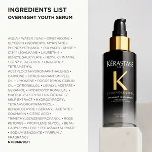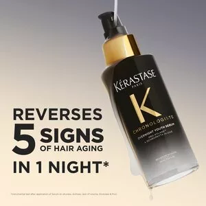 Serum na Noc Chronologiste od Kérastase to zaawansowana kuracja nocna bez spłukiwania, która pomaga korygować widoczne oznaki starzenia się włosów. Formuła wzbogacona o Pro-Xylane™ oraz algi Ochrophyta została stworzona, aby podczas snu intensywnie regenerować włosy i przywracać im młodzieńczy wygląd.
