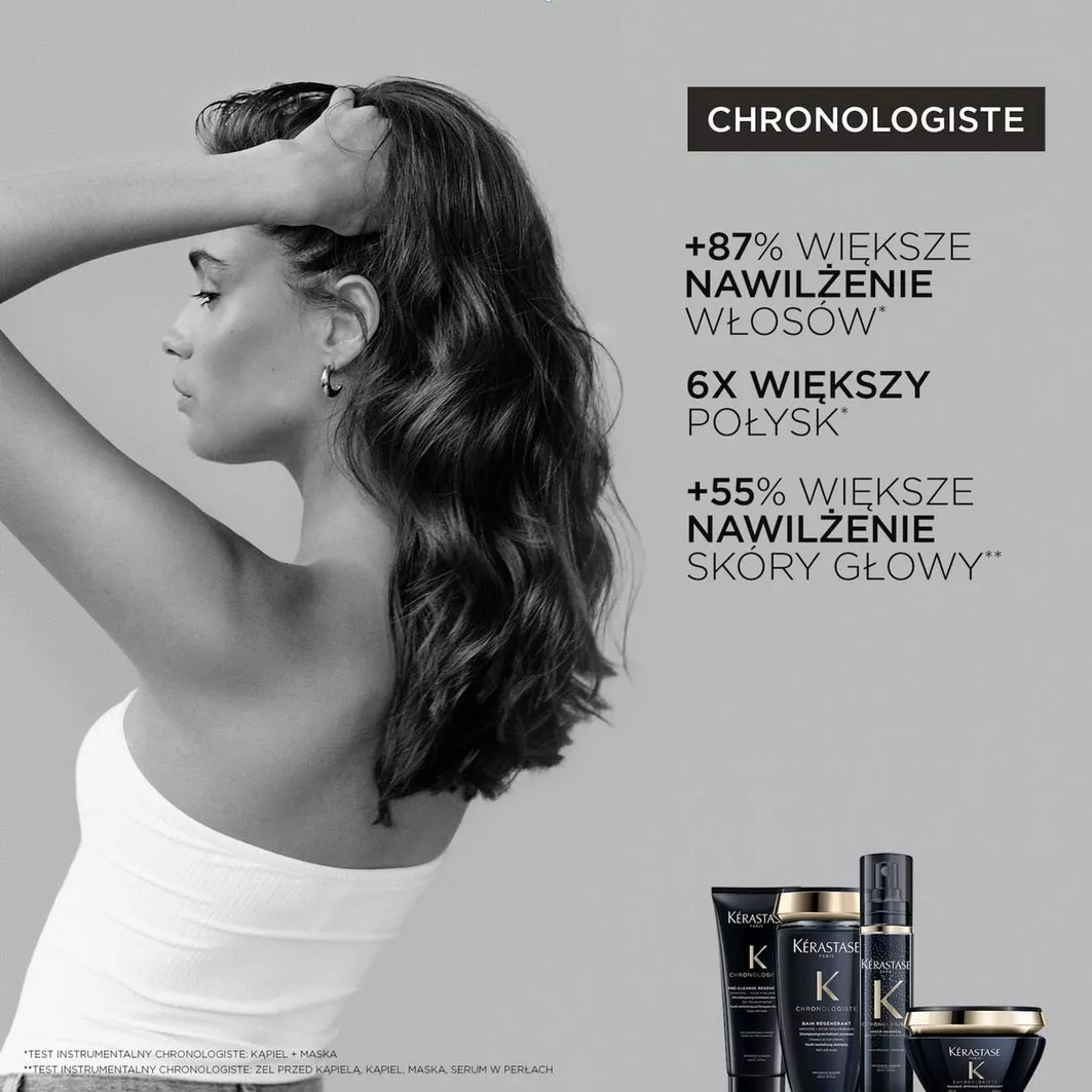 Gama produktów Chronologiste od Kérastase po raz kolejny łączy zaawansowaną technologię i luksusową zmysłowość, aby uzyskać pielęgnację, która całkowicie rewitalizuje włosy, od skóry głowy po końcówki włosów. Chronologiste, z wyjątkową konsystencją produktów i zmysłowymi zapachami, zapewnia kobietom luksusowe doznanie, dzięki któremu skóra głowy jest zregenerowana, a włosy piękniejsze.