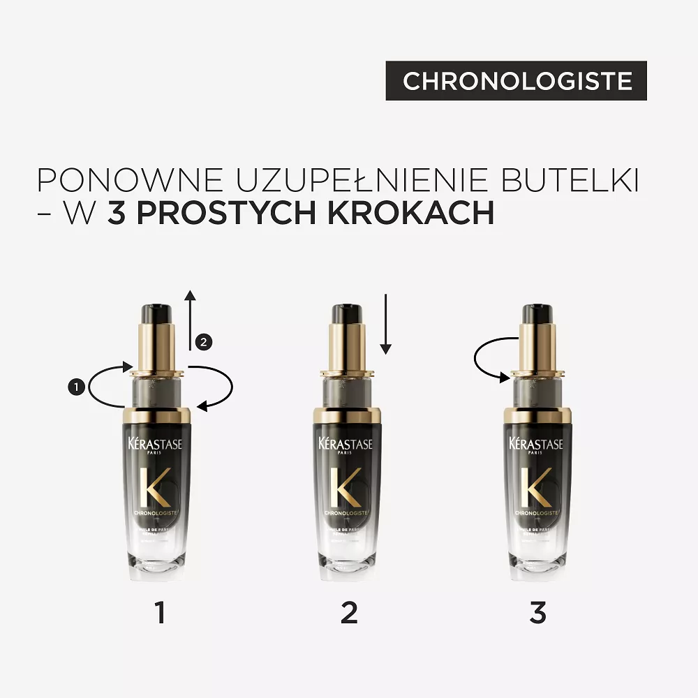 W 3 prostych krokach możesz wielokrotnie napełnić butelkę: 1 Odkręć pusty wkład na olejek i oddziel go od szklanej butelki 2. Rozpakuj nowy wkład z olejkiem i umieść go w szklanej butelce. 3. Obróć wkład zgodnie z ruchem wskazówek zegara, aby go umocować w butelce, a pusty wkład zutylizuj usuwając z niego pompkę