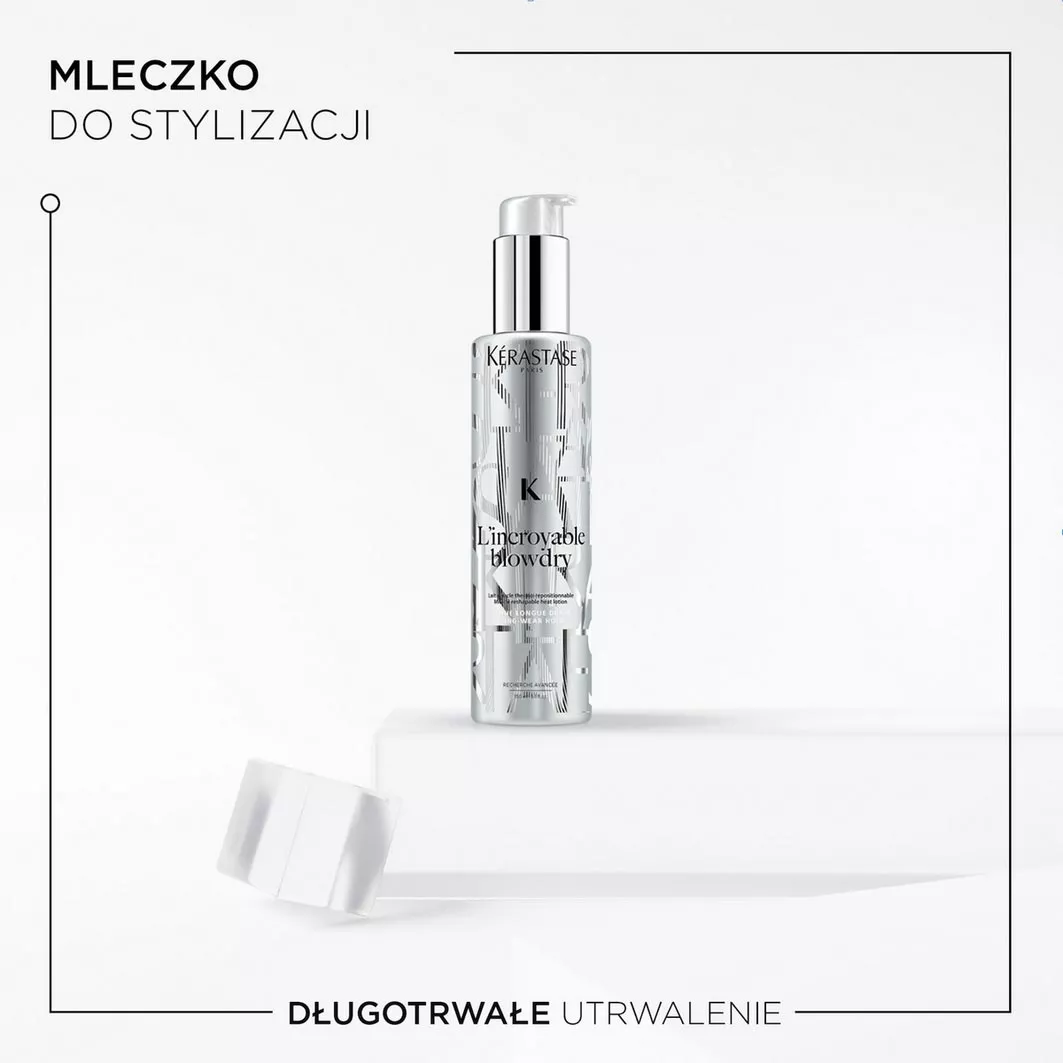 Lotion do stylizcji włosów Kerastase Couture Styling L'Incroyable Blowdry to kosmetyk o konsystencji mikrowosku, którego działanie aktywuje się wraz z ciepłem. Swoje działanie opiera na innowacyjnej technologii SRS, są to mikrocząsteczki wosku, które pod wpływem ciepła otulają włóka włosowe i ułatwiają stylizację i restylizację. Produkt zapewnia długotrwały efekt utrwalenia oraz pamięć kształtu fryzury. Zapobiega puszeniu się włosów aż do 96 godzin oraz niweluje puszenie o 80%. Ponadto chroni włosy przed działaniem wysokiej temperatury. Aby restylizować włosy należy użyć temperatury min. 150ºC.