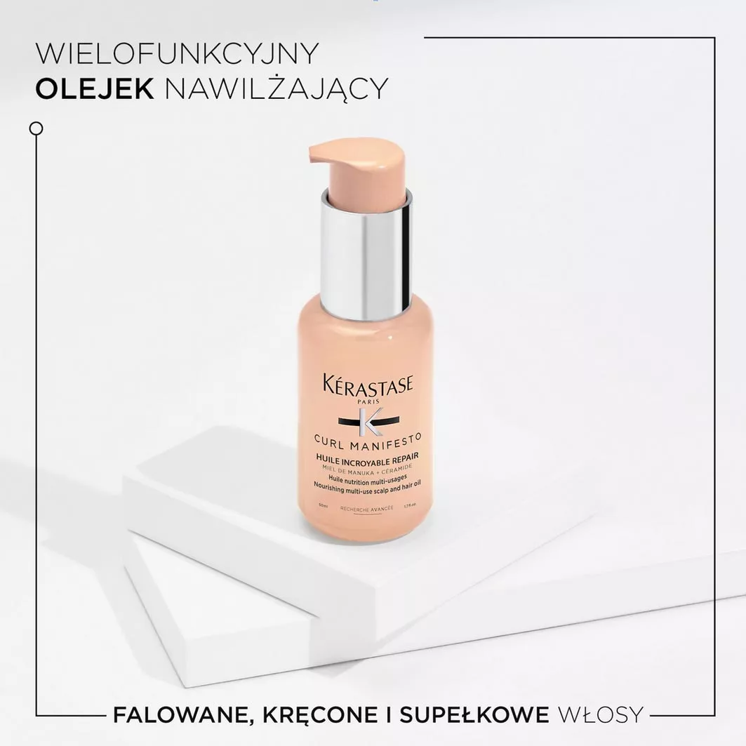 Odżywczy, wielofunkcyjny olejek do skóry głowy oraz falowanych, kręconych i supełkowych włosów Kerastase Curl Manifesto. Ten odżywczy olejek może być używany w różnych etapach rutyny pielęgnacyjnej dla nawilżenia i uwydatnienia połysku. Odżywczy Olejek Curl Manifesto nie zawiera parabenów, siarczanów i olejów mineralnych.