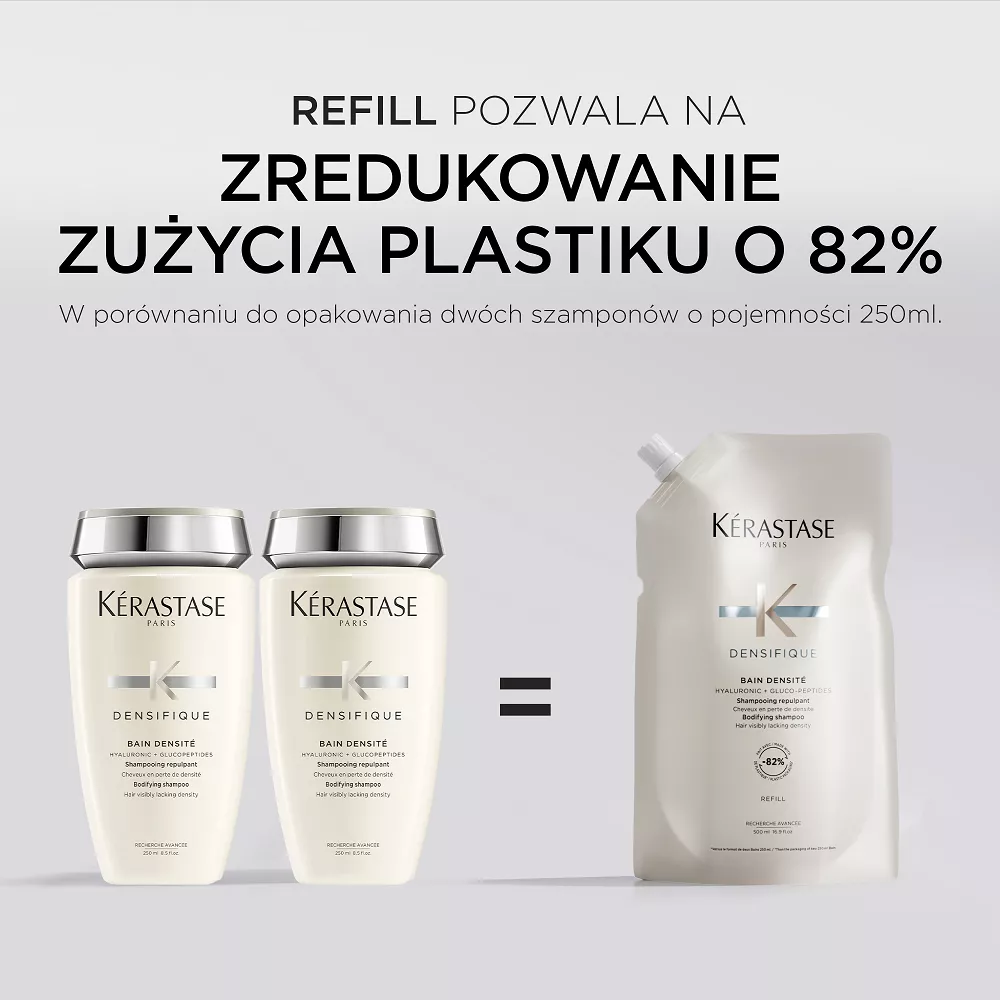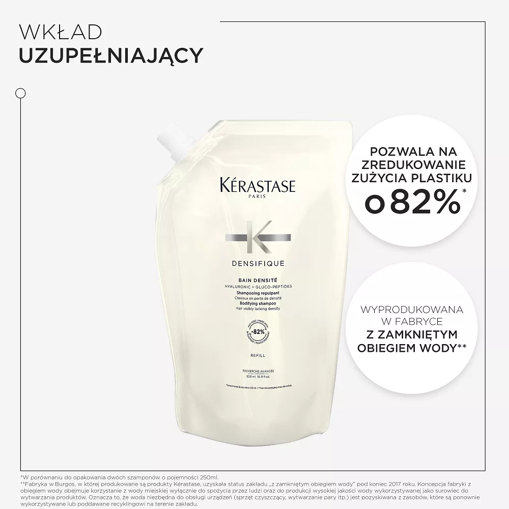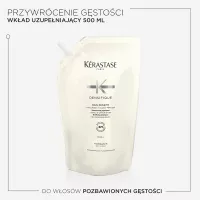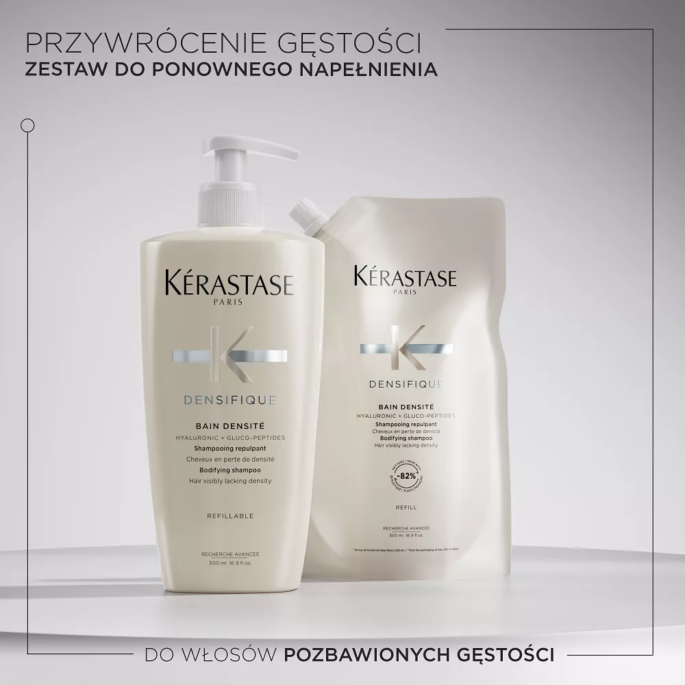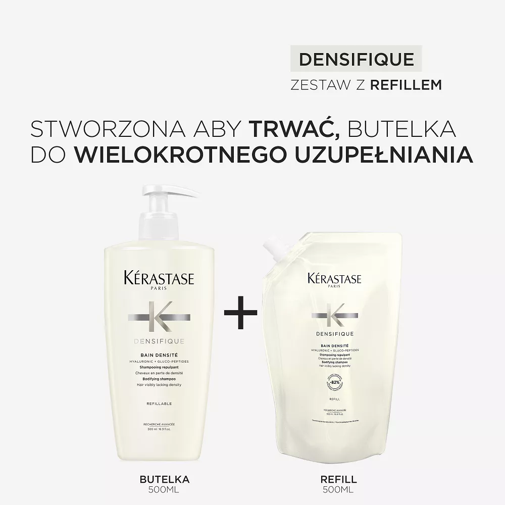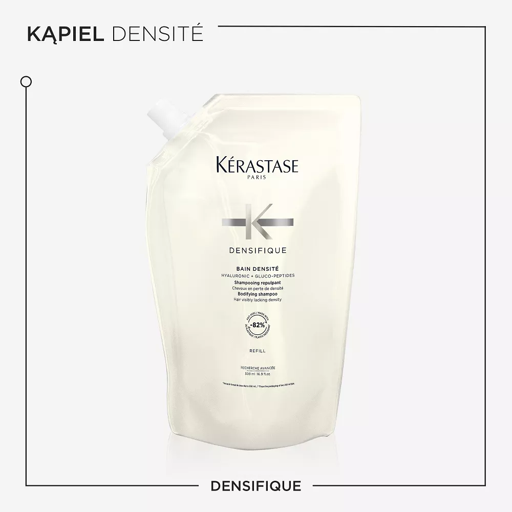 Kerastase Densifique, szampon jest przeznaczony do włosów dotkniętych problemem utraty gęstości. Kąpiel Densité wzmacnia włosy zaczynając od ich włókien i sprawia, że stają się bardziej odporne. Przywraca włosom gęstość i sprężystość sprawiając, że stają się widocznie gęstsze i grubsze.