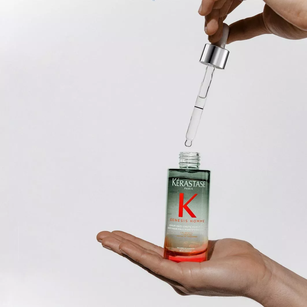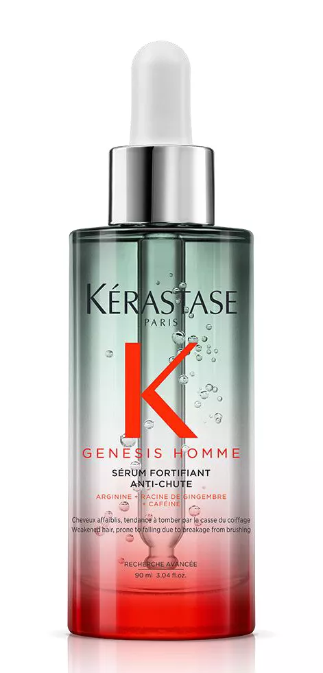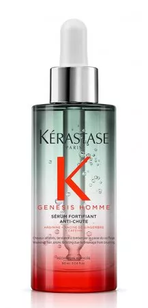 Serum wzmacniające włosy Kerastase Genesis Homme zapobiega nadmiernemu wypadaniu, wzmacnia włosy i przywraca równowagę skórze głowy. Serum może być stosowane codziennie. Polecane do włosów ze skłonnością do przerzedzania. W składzie kreatyna, korzeń imbiru i aminexil. Kosmetyk zmniejsza utratę włosów, koi skórę głowy i wspiera odbudowę naturalnej bariery ochronnej skóry głowy.