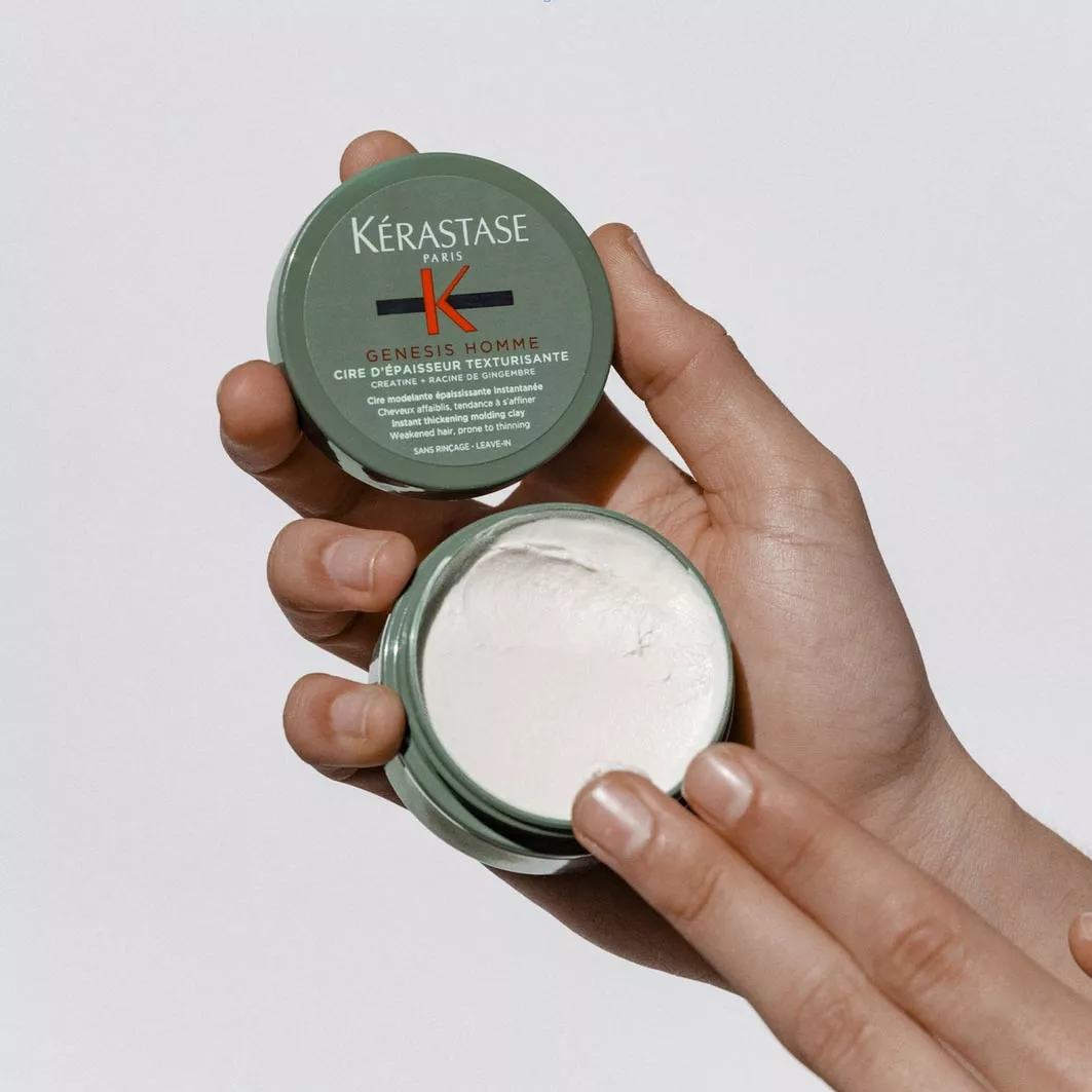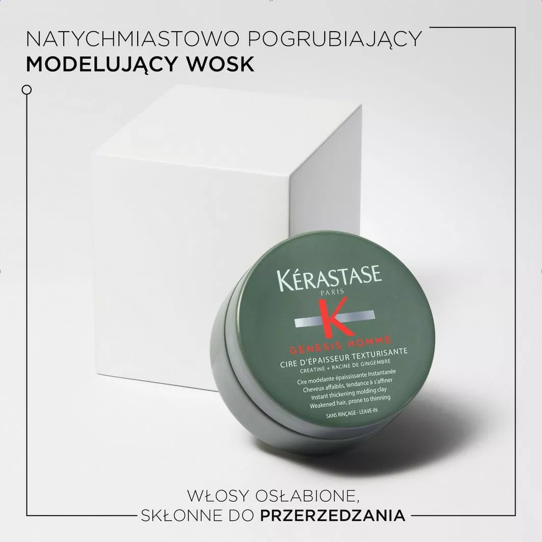 Wosk do stylizacji włosów Kerastase Genesis Homme błyskawicznie sprawia, że włosy cienkie i skłonne do przerzedzania nabierają objętości. W składzie wosku znajduje się korzeń imbiru i kreatyna. Wosk daje efekt pełniejszych włosów, pozwala cieszyć się ich objętością. Kosmetyk pogrubia pasma i zwiększa ich średnicę. Natychmiastowe działanie!