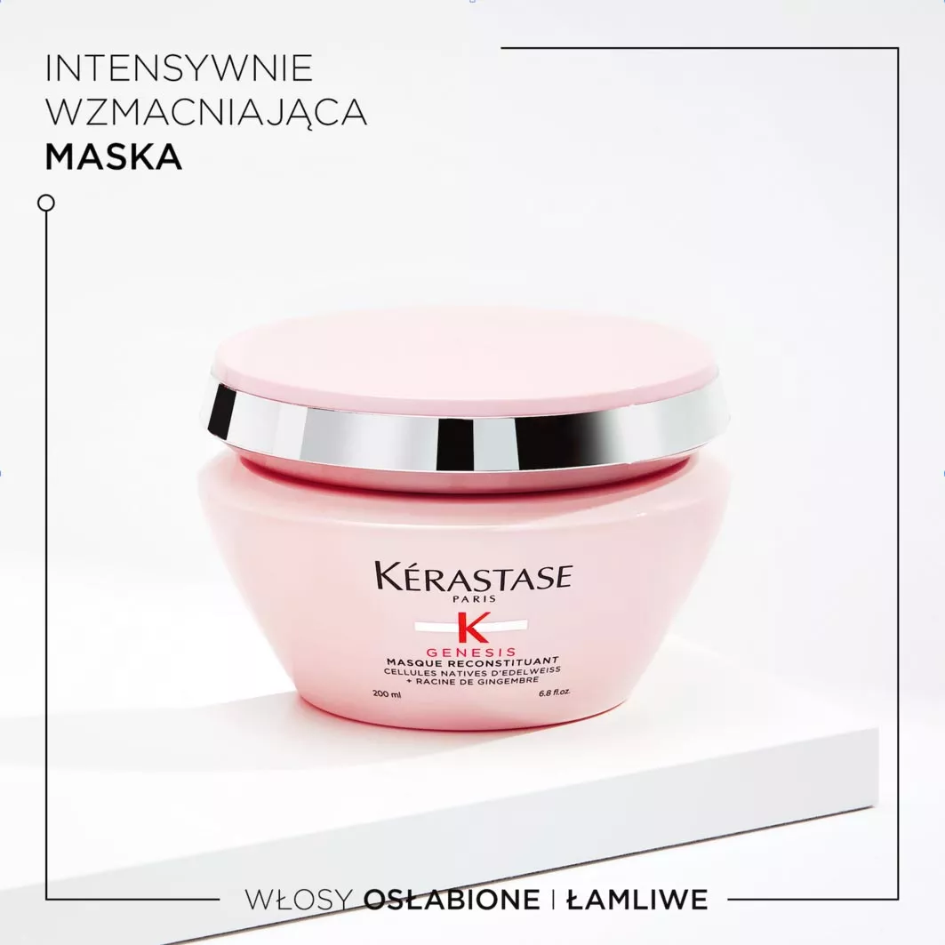 Maska do włosów Kerastase Genesis wykazuje silne działanie wzmacniające. Kosmetyk jest sposobem na zachowanie gęstości włosów osłabionych bez ich obciążania. Bogata formuła z szarotką alpejską i korzeniem imbiru lekarskiego niezwykle intensywnie odżywia włosy i wzmacnia je od wewnątrz - bez obciażania. Maska działa w tych obszarach, w kórych doszło we włosach do zniszczeń. Pasma stają się mocniejsze i mniej łamliwe, miękkie, błyszczące i pięknie się układają.