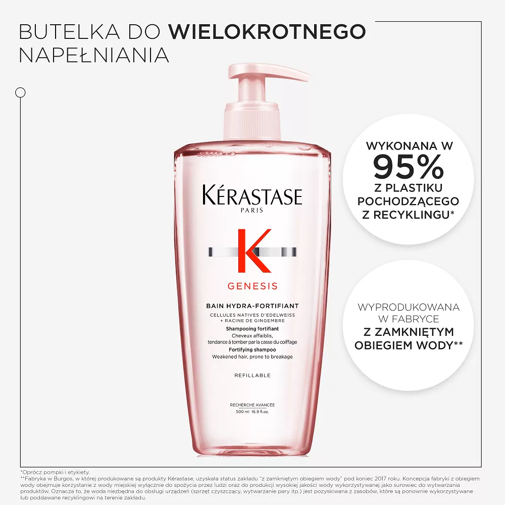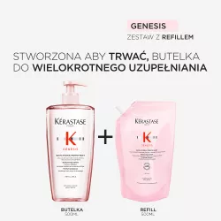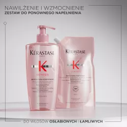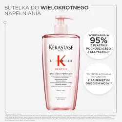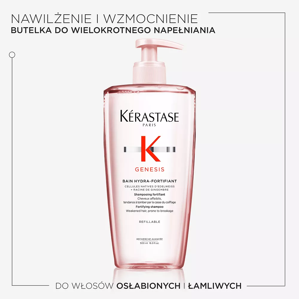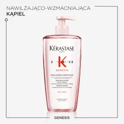 Szampon do włosów Kerastase Genesis doskonale wzmacnia i nawilża włosy słabe, łamliwe, wypadające i tracące gęstość. A do tego łagodnie oczyszcza pasma i skórę głowy. To pierwszy krok, jeśli chcesz ograniczyć wypadanie spowodowane łamliwością włosów. Bardzo delikatna formuła tego kosmetyku usuwa sebum oraz wszelkie zanieczyszczenia ze skóry głowy. Kapiel polecana jest do włosów przetłuszczających się. Warto dodać, że kosmetyk łagodzi podrażnienia skóry głowy i sprawia, że włosy zyskują niezwykłą lekkość. W składzie znajdują się komórki macierzyste szarotki alpejskiej, która jest silnym antyoksydantem. A dodatkowo korzeń imbiru lekarskiego zwiększa odporność włosów na uszkodzenia.