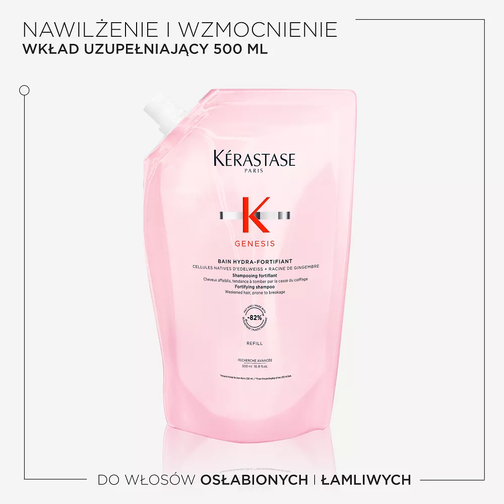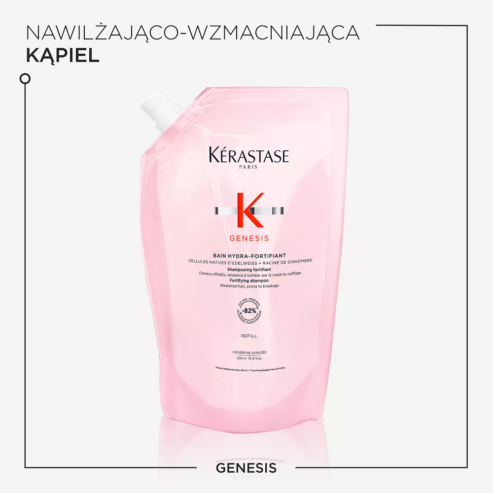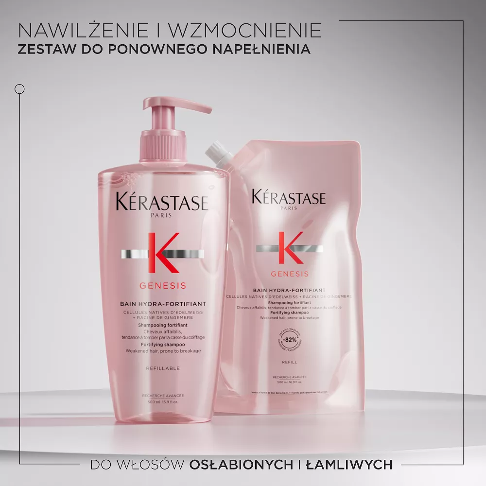 Kerastase Genesis wzmacniający szampon do włosów osłabionych, z tendencją do wypadania z powodu łamliwości. Delikatnie oczyszcza i wzmacnia włókno włosa zmniejszając ryzyko wypadania spowodowane ich łamaniem się. Ta niezwykle delikatna formuła jest idealna do włosów cienkich lub przetłuszczających się, gdyż eliminuje nadmiar sebum i cząstki zanieczyszczeń ze skóry głowy i włosów. Ma delikatne działanie oczyszczające, a jednocześnie nawilża włosy od nasady aż po końce, pozostawiając uczucie lekkości. Wzbogacona połączeniem komórek szarotki alpejskiej i korzenia imbiru formuła wzmacnia włókno, zapewniając włosom optymalną sprężystość i zmniejszając ryzyko wypadania z powodu łamliwości. Włosy stają się mocniejsze, zyskują gęstość i zdrowy wygląd.