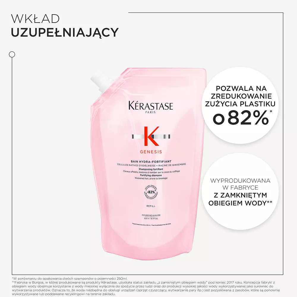 Butelka szamponu o pojemności 500ml do ponownego uzupełniania jest wykonana w 95% z plastiku pochodzącego z recyklingu* i wyprodukowana w fabryce ""z zamkniętym obiegiem wody”**, która osiągnęła 100% energii odnawialnej*** oraz z możliwością ponownego uzupełnienia wkładem uzupełniającym pozwalającym na zredukowanie zużycia plastiku o 82%****.