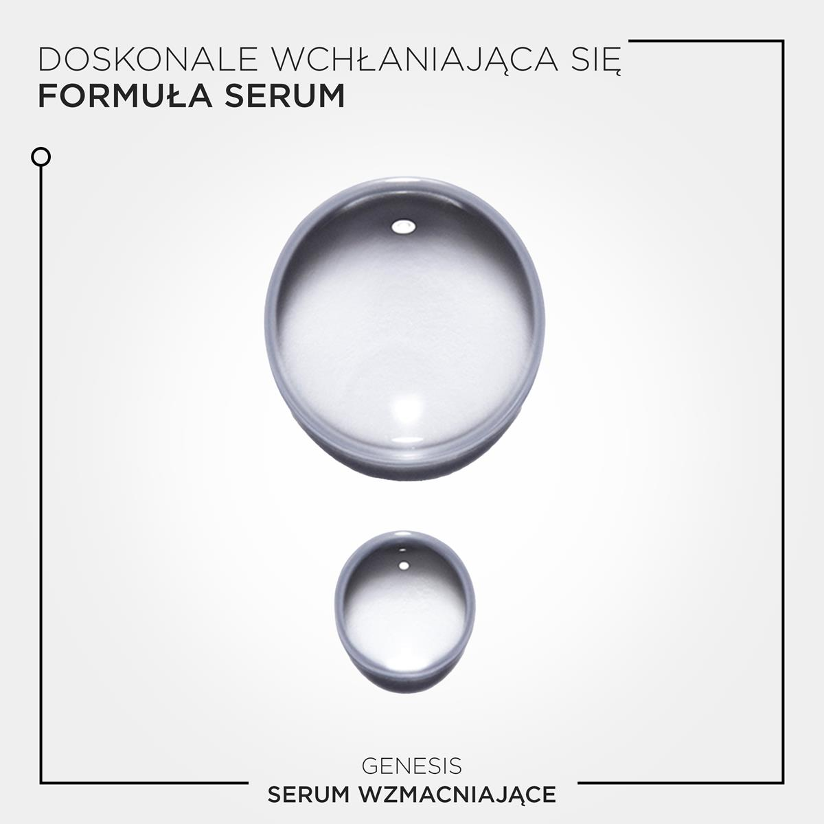 Serum do włosów łamliwych i wypadających Kerastase Genesis wzmacnia pasma każdego dnia i zmniejsza ich wypadanie. W składzie znajdują wysoce skuteczne składniki aktywne, które wzmacniają włosy, zmniejszają stopień ich wypadania i poprawiają ich wygląd. Mieszki włosowe lepiej się osadzają w skórze głowy. Poza tym włosy mają zapewnione doskonałe warunki do wzrostu. Serum łagodzi podrażnienia skóry głowy i wzmacnia barierę ochronną. Kosmetyk ma żelową konsystencję, co sprawia, że produkt łatwo aplikować - nie rozlewa się on po głowie. Regularne stosowanie sprawia, że włosy są mocniejsze, pełniejsze i zdrowsze. W składzie tego kosmetyku znajduje się 1.5% aminexil, który wzmacnia osadzenie włosa w skórze głowy. Dodatkowo korzeń imbiru lekarskiego zapewnia ochronę przed szkodliwymi substancjami, zaś kofeina poprawia mikrokrążenie skóry głowy.