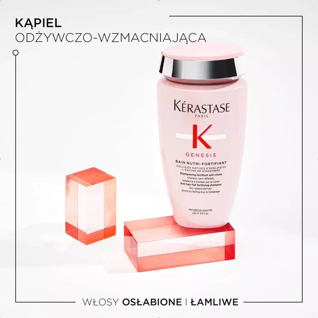 Wzbogacona kapiel przeciw wypadaniu włosów Kerastase Genesis poprawia gęstość włosów i wzmacnia je, sprawiając, że są zdrowe, mniej łamliwe i puszyste. Szampon skutecznie oczyszcza i wzmacnia pasma, tworząc delikatną pianę, która usuwa zanieczyszczenia i nadmiar sebum. Suche wlosy są nawilżone i odżywione. Połączenie szarotki alpejskiej i korzenia imbiru zwiększa odporność włosów i przeciwdziała ich wypadaniu. Mocne, zdrowe, lśniące włosy wydają się gęstsze.