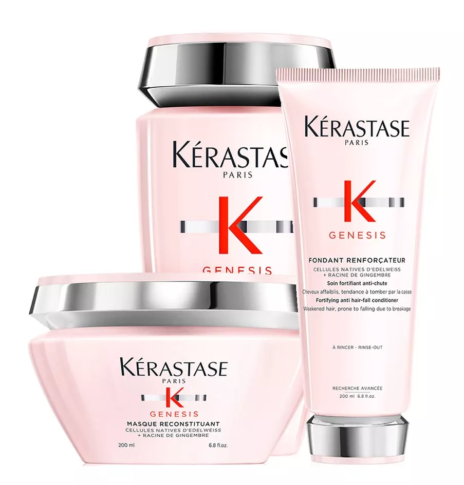 Włosy mogą wypadać z różnych przyczyn. Do nadmiernego wypadania włosów i utraty ich gęstości doprowadzić może stres, zła dieta, ciągłe życie w biegu, choroby i zmiany hormonalne, zanieczyszczenia. Z problemem tym borykają się coraz częściej osoby młode. I właśnie z myślą o nich powstał zestaw kosmetyków przeciw utracie gęstości włosów Kerastase Genesis. Kąpiel Kerastase Genesis zmniejsza odczuwalnie łamliwość włosów i podnosi ich odporność na uszkodzenia. Odżywka wzmacnia włosy i odbudowuje ich powierzchnię, zwiększa przy tym odporność na uszkodzenia i zanieczyszczenia. Dodatkowo maska zapewnia bardzo intensywną pielęgnację - redukuje utratę gęstości włosów, poprawia ich miękkość i siłę. W składzie tych kosmetyków znajduje się szarotka alpejska i imbir lekarski.