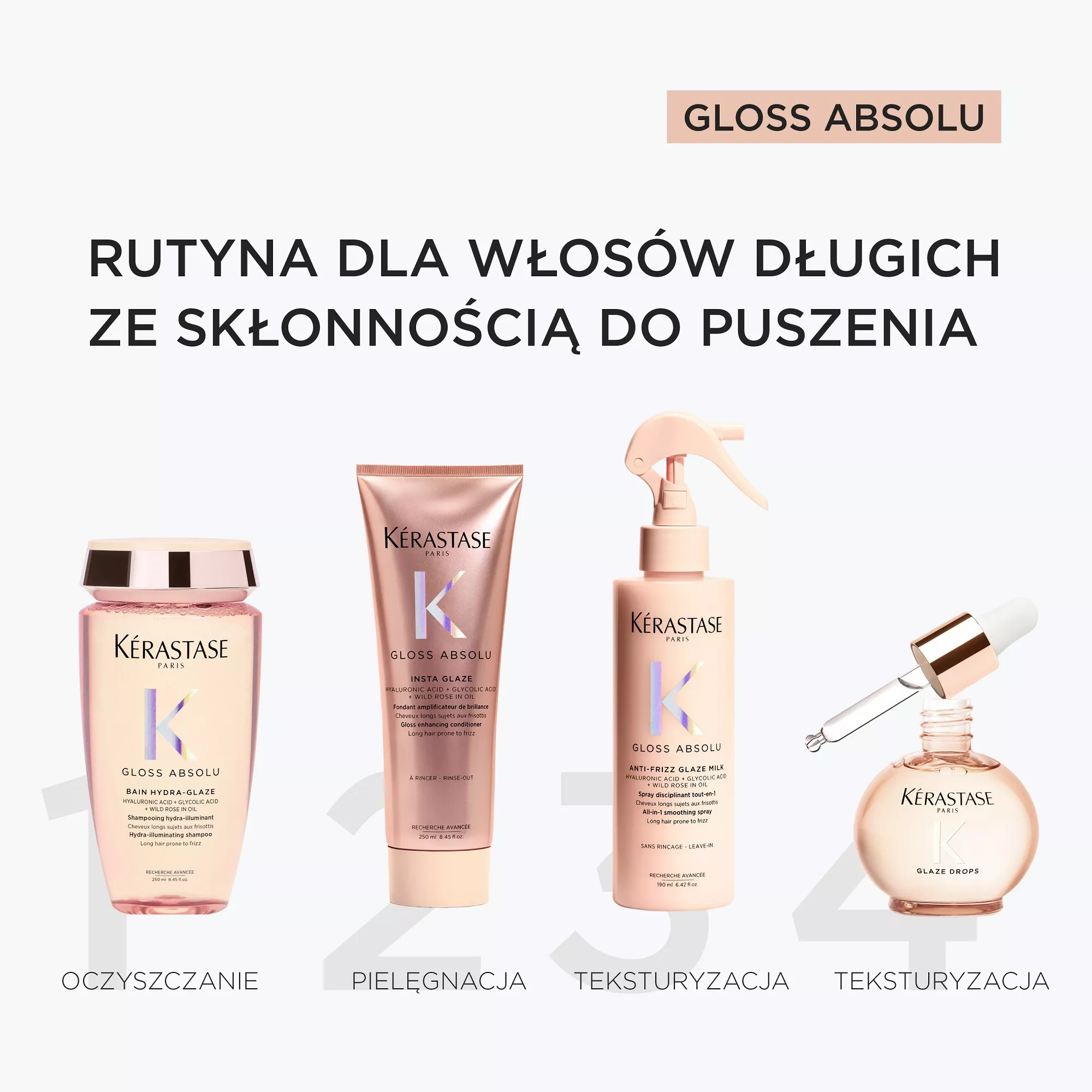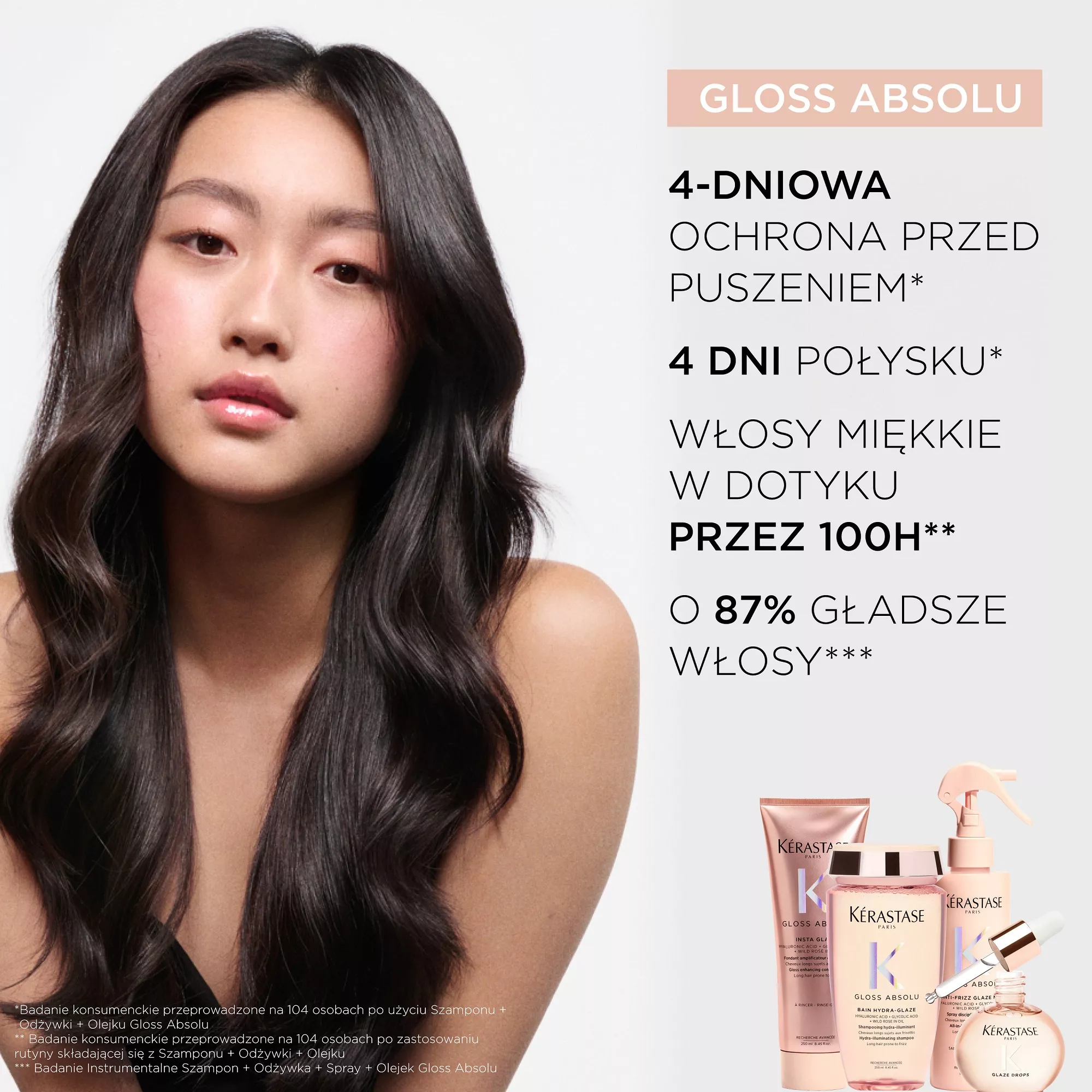 *Badanie konsumenckie przeprowadzone na 104 osobach po użyciu Kąpieli + Odżywki + Olejku Gloss Absolu