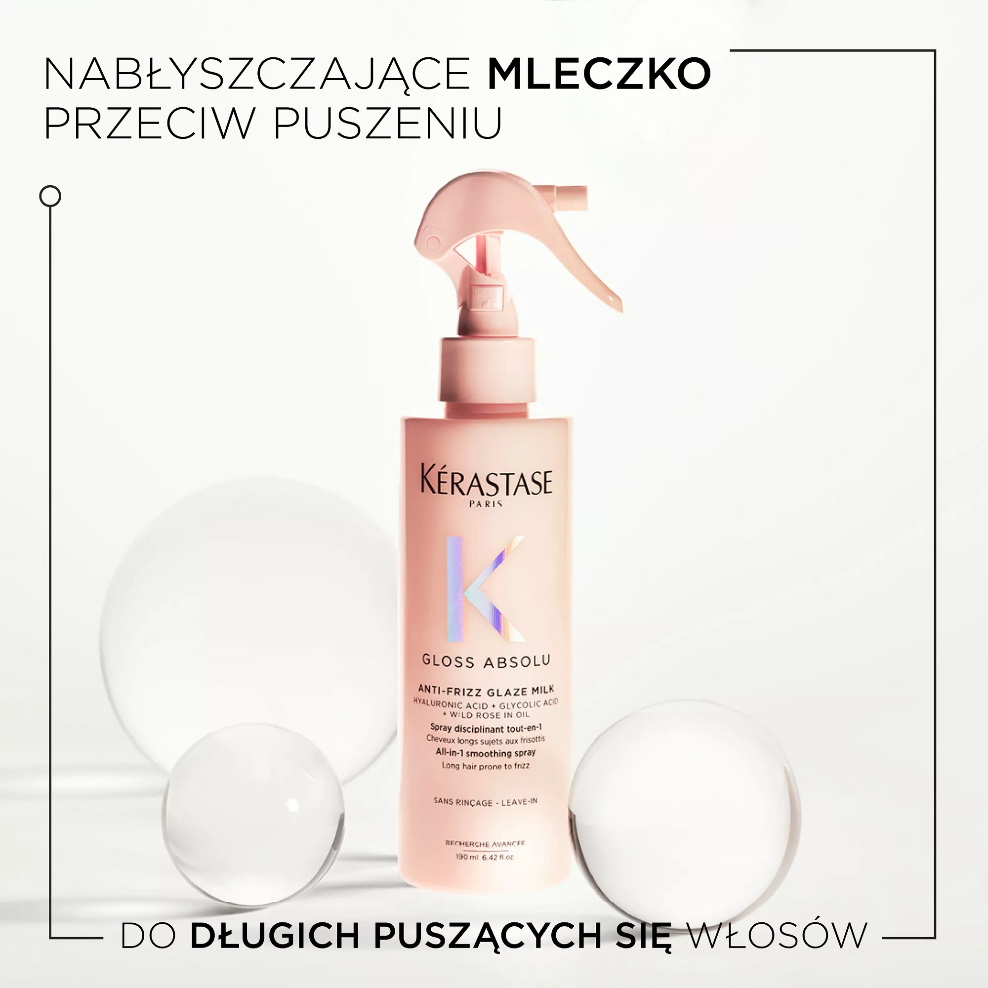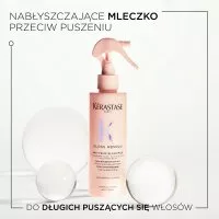 Mleczko Anti-Frizz Glaze od Kérastase to spray wygładzający all-in-1 do długich, puszących się włosów. Specjalna formuła z kwasem hialuronowym, kwasem glikolowym i olejkiem z dzikiej róży nadaje włosom wymarzoną sprężystość i piękny blask. Dzięki lekkiej konsystencji mleczka, ten doskonale wnikający we włosy wielofunkcyjny spray błyskawicznie ułatwia rozczesywanie, nawilża, wygładza, ułatwia suszenie, eliminuje puszenie i odstające włoski, jednocześnie chroniąc włosy przed wysoką temperaturą i wilgocią